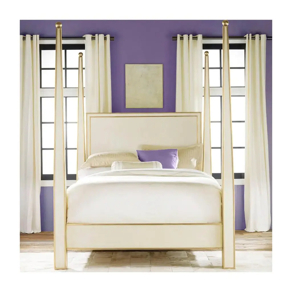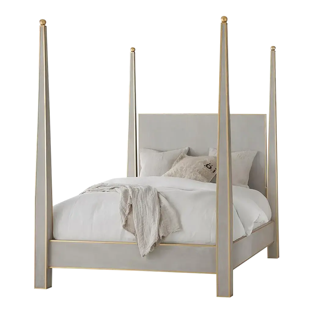 A Modern Gustavian Cream Painted Four Poster Bed. A wonderful combination of antique Gustavian design and modern details. The posters are in a tapered pyramidal form with gilded trim and ball finials. The antique grey-painted headboard and frame also with gilded trim details.US King Dimensions: 80" W x 90" D x 91" H