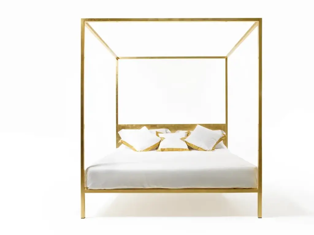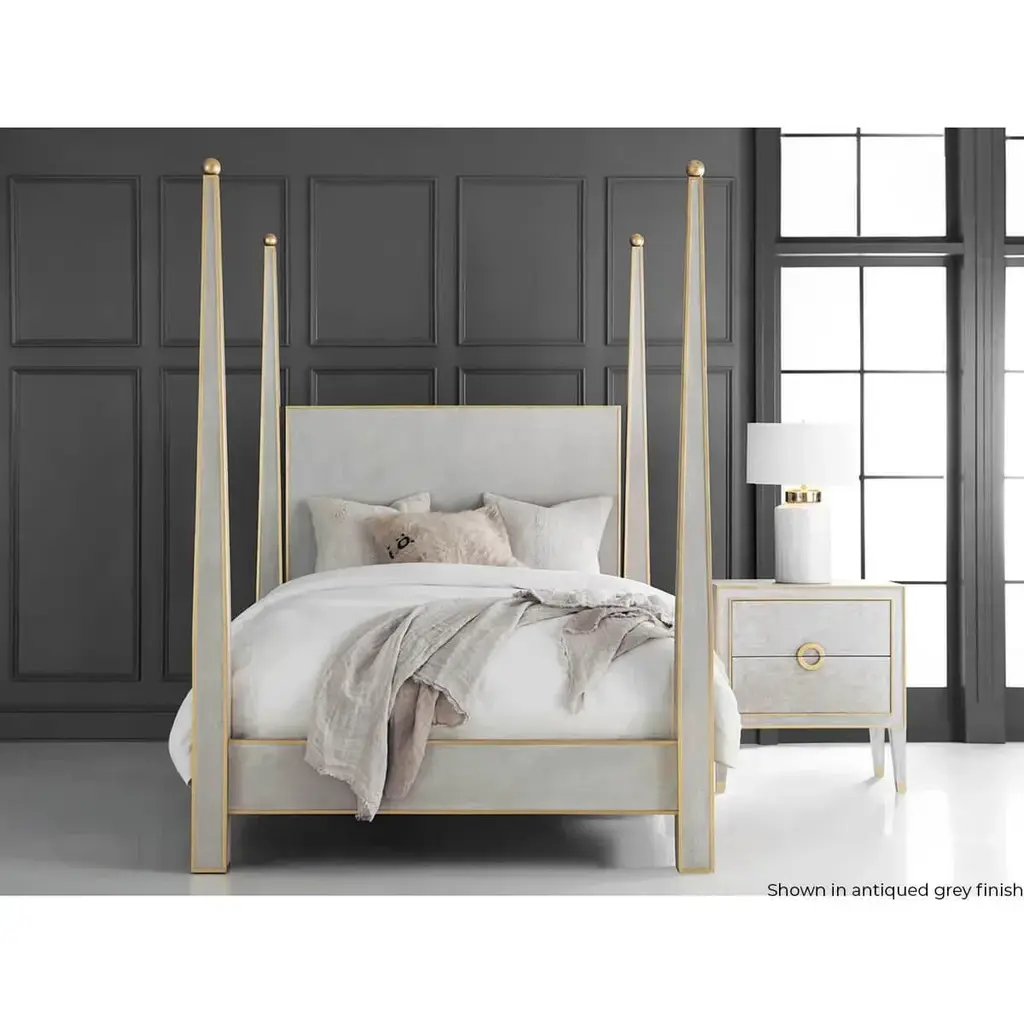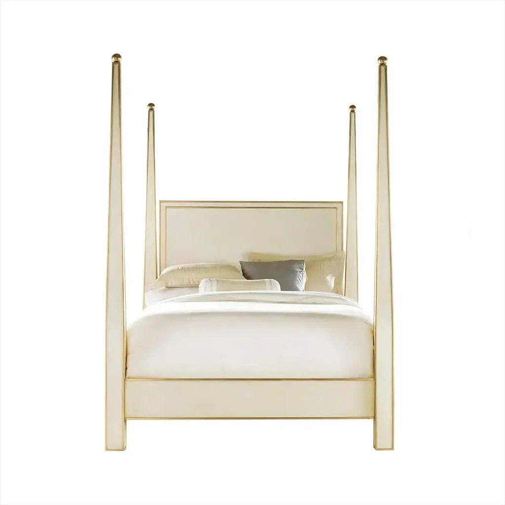 A Modern Gustavian Cream Painted Four Poster Bed. A wonderful combination of antique Gustavian design and modern details. The posters are in a tapered pyramidal form with gilded trim and ball finials. The antique grey-painted headboard and frame also with gilded trim details. US King Dimensions: 80" W x 90" D x 91" H