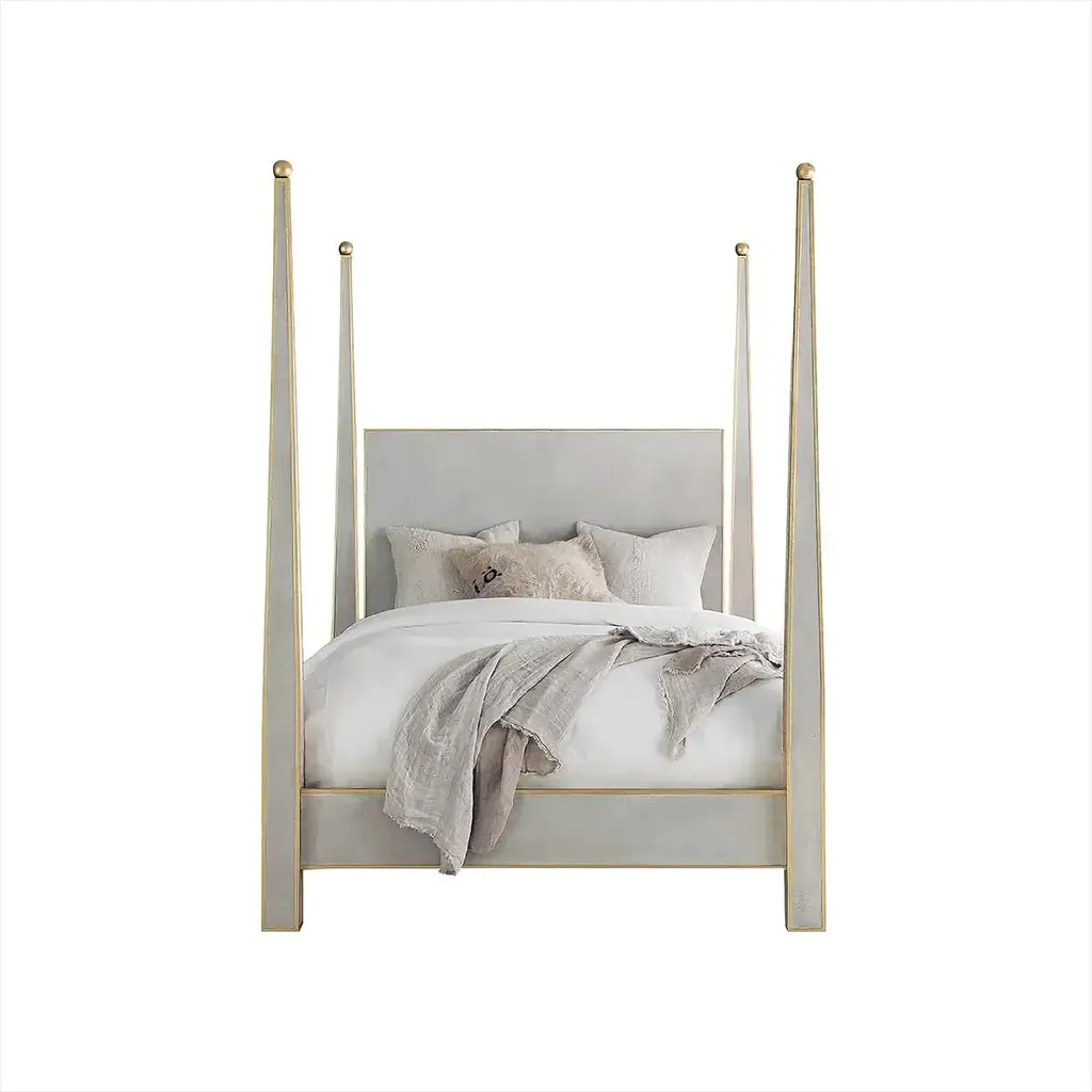 A Modern Gustavian Grey Painted Four Poster Bed. A wonderful combination of antique Gustavian design and modern details. The posters are in a tapered pyramidal form with gilded trim and ball finials. The antique grey-painted headboard and frame also with gilded trim details. US King Dimensions: 80" W x 90" D x 91" H