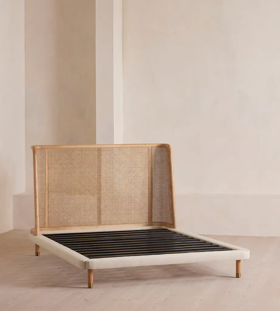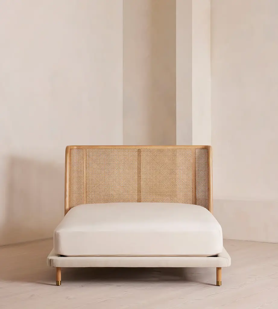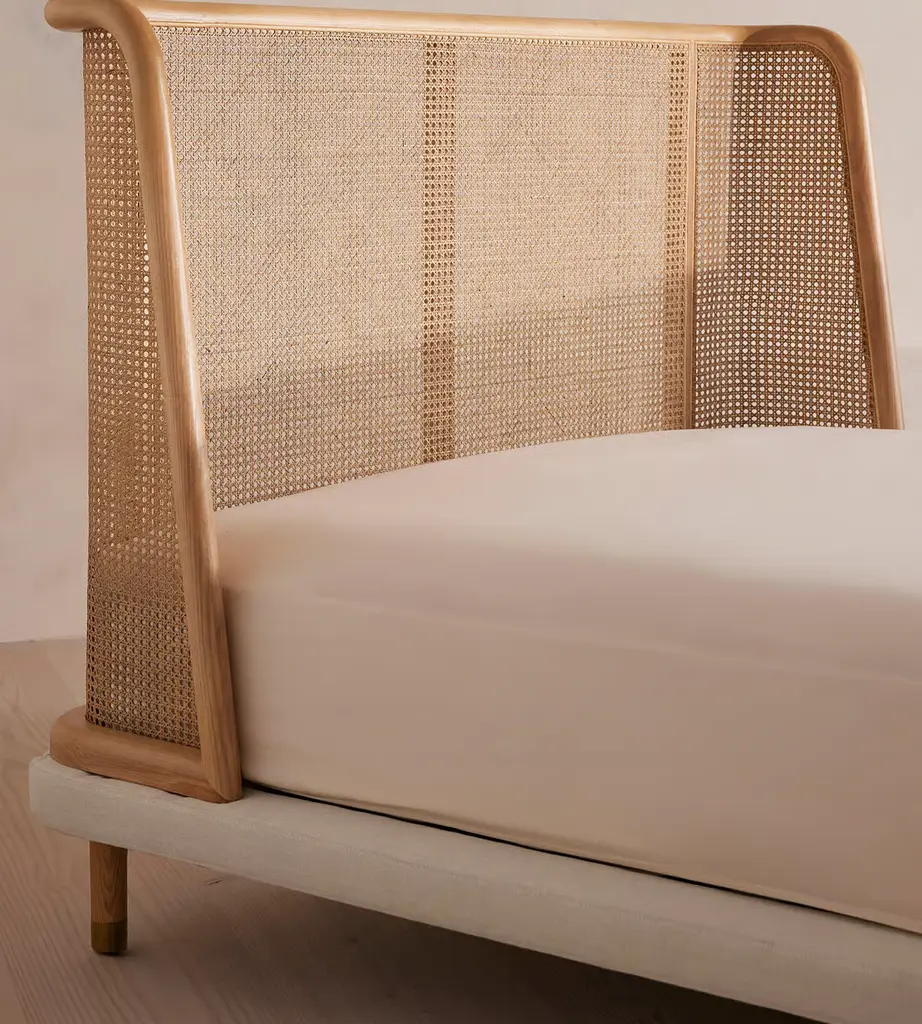 Referencing the rattan and cane furniture in the bedrooms at Soho House Mumbai, our Hasker bed features a gently curved ash headboard with cane panel inserts. Encased in pure linen, the base rests on low timber legs, creating a streamlined sillouhette.