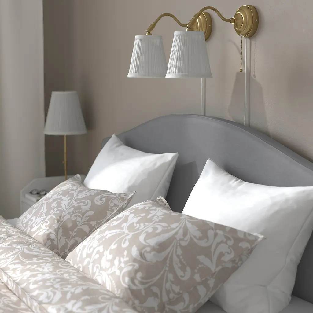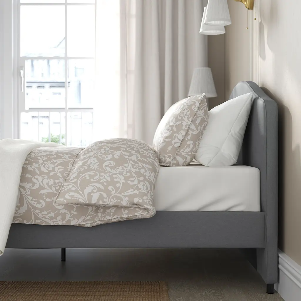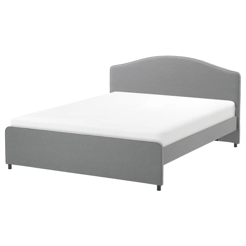 HAUGA Upholstered bed frame - Vissle gray Full. Designed to coordinate perfectly with the rest of the HAUGA series, the upholstered bed frame adds a touch of softness to your bedroom, bringing comfort during the night, and adding style around the clock. Mattress and bedlinens are sold separately.