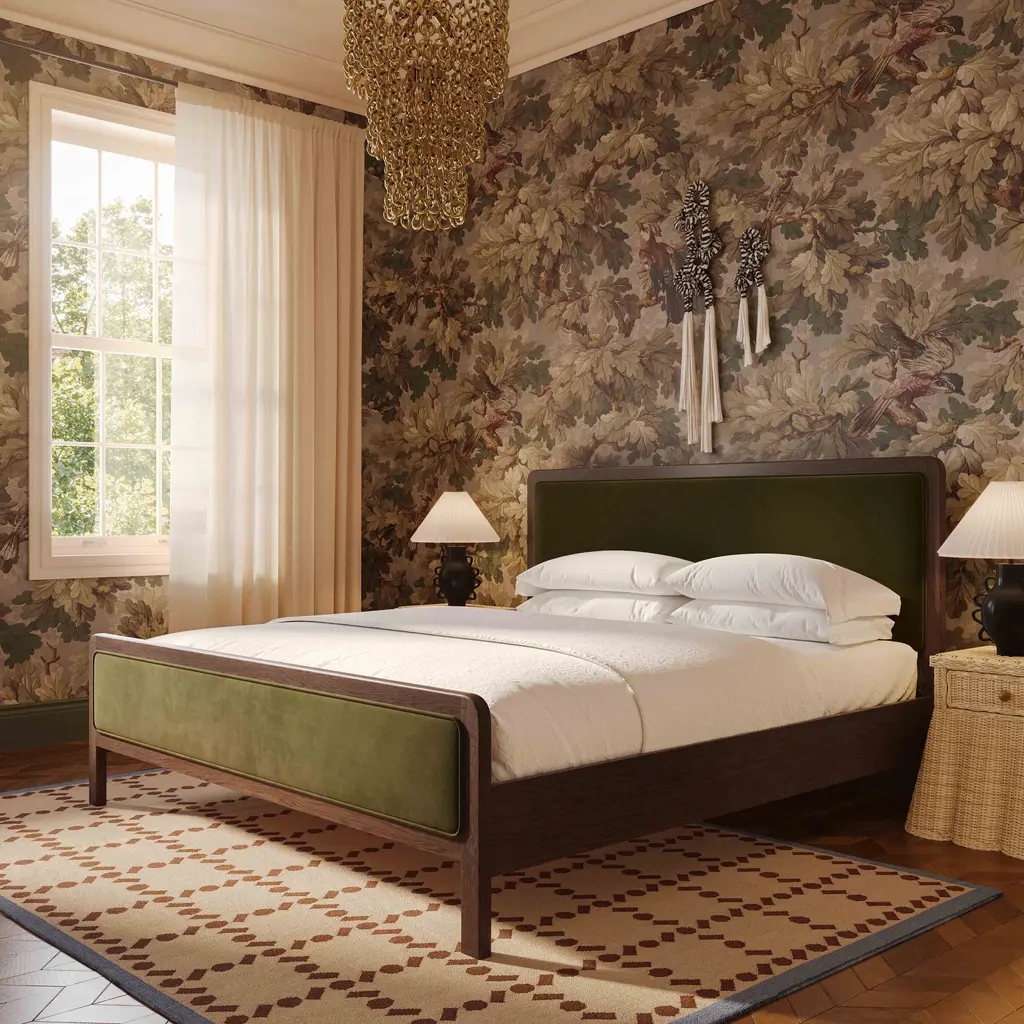 The Hella Velvet Bed strikes a refined balance between mid-century and modern, wrapped in soft matte velvet with a solid wood frame. Available in forest green or taupe, it’s a grounded, design-conscious piece made to suit any space.