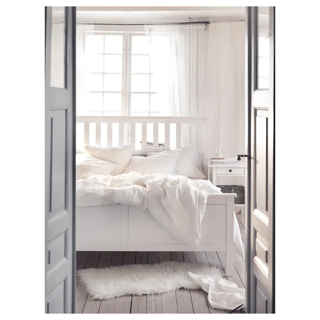 HEMNES Bed frame - white stain/Luröy King. The sturdy solid pine frame has natural variations in grain, color and texture, giving every piece a unique look. And it has been stained and lacquered making it more durable and easy to care for. Mattress and bedlinens are sold separately.