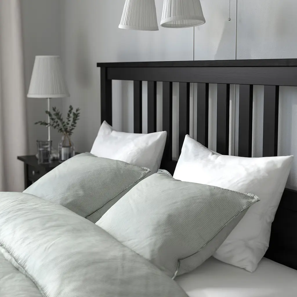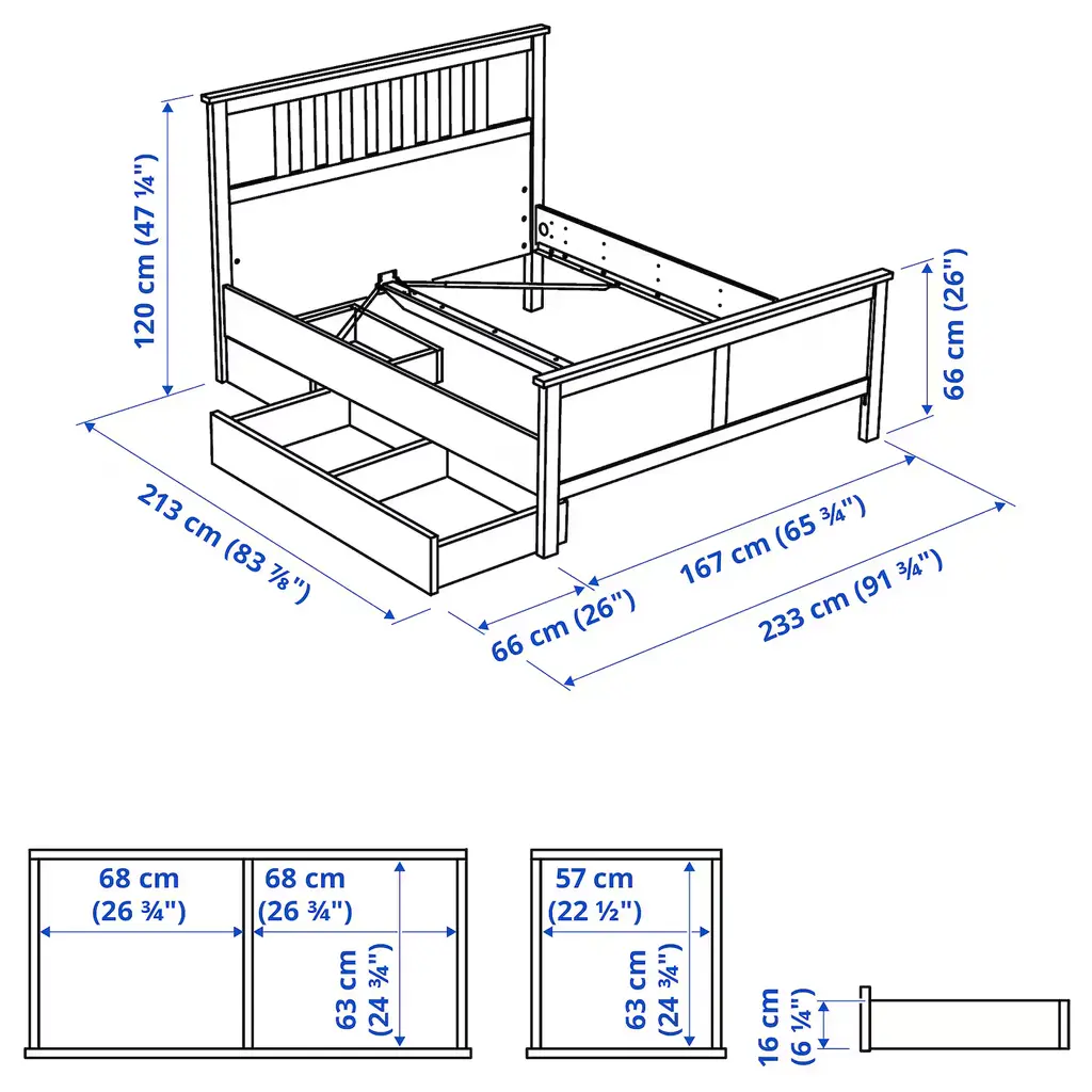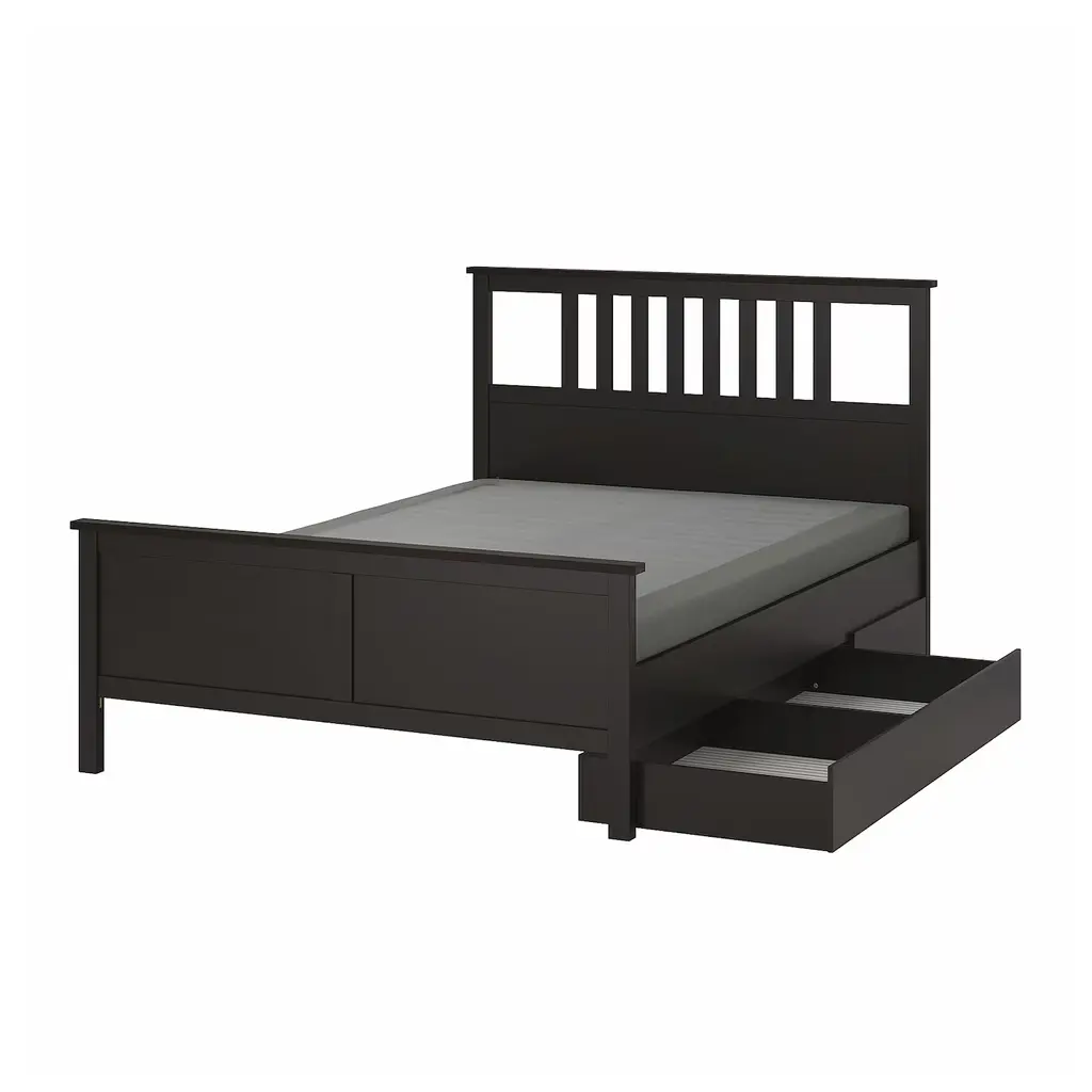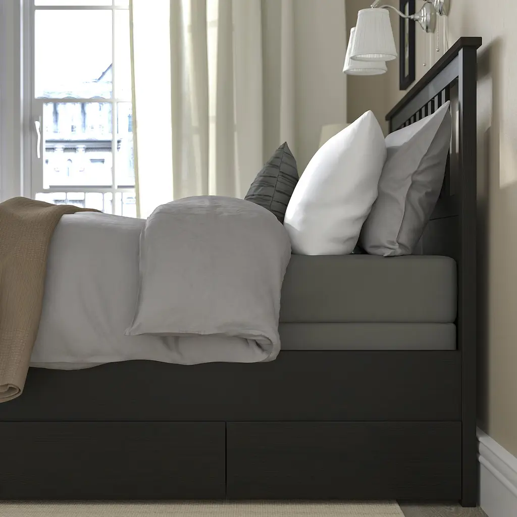HEMNES Bed frame with 2 storage boxes - black-brown/Lyngör dark gray Queen. Made of solid wood, which is a durable and warm natural material. The 2 large drawers give you an extra storage space under the bed. LYNGÖR mattress base has flat slats for an even and uniform foundation for the mattress.