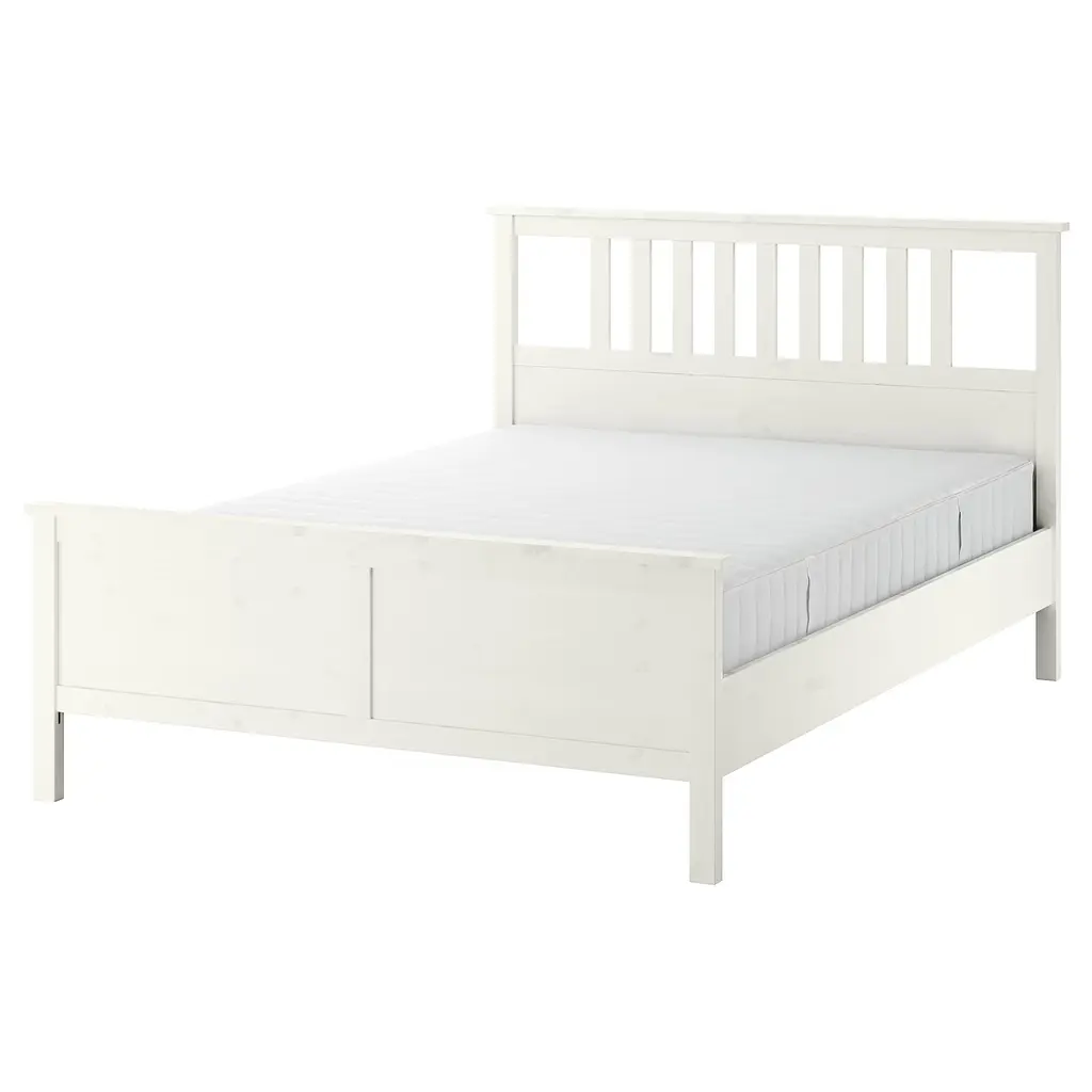 HEMNES Bed frame with mattress - white stain/Valevåg medium firm Queen. The sturdy solid pine frame has natural variations in grain, color and texture, giving every piece a unique look. And it has been stained and lacquered making it more durable and easy to care for.