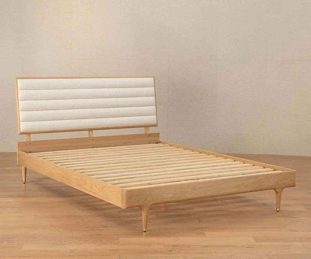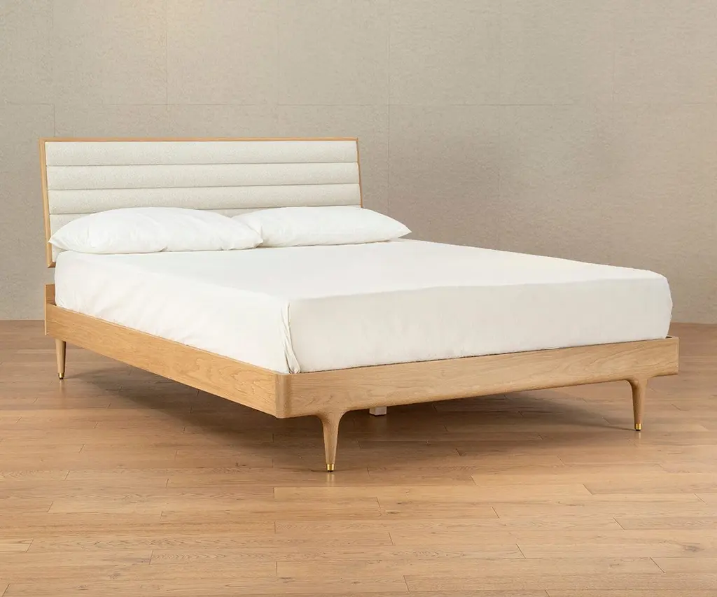 Crafted from solid white oak, the Hendrick Bed's durable frame is modeled after enduring mid-century designs with simple lines and tall tapered legs. Tufted upholstery on the headboard lends a modern edge, while brass leg caps round out this sophisticated look.