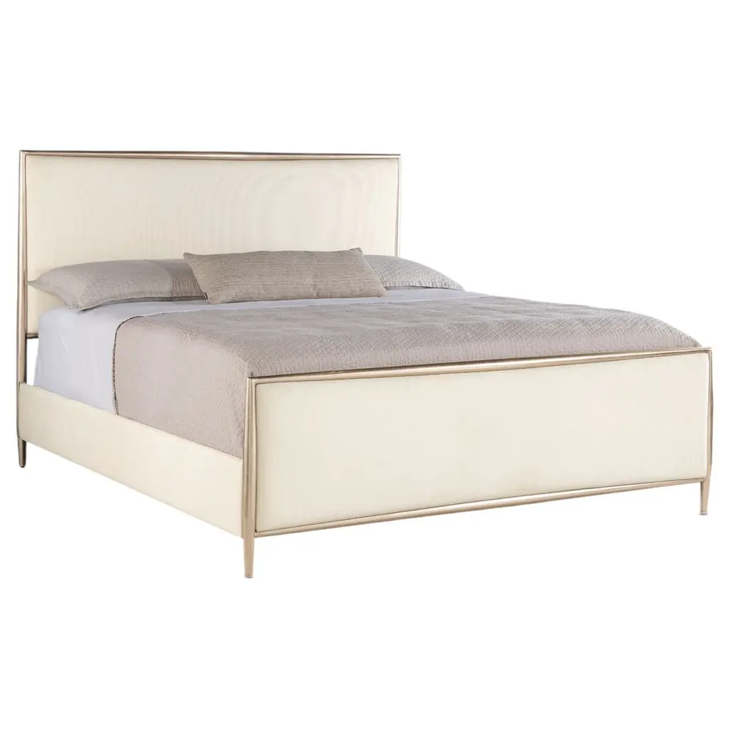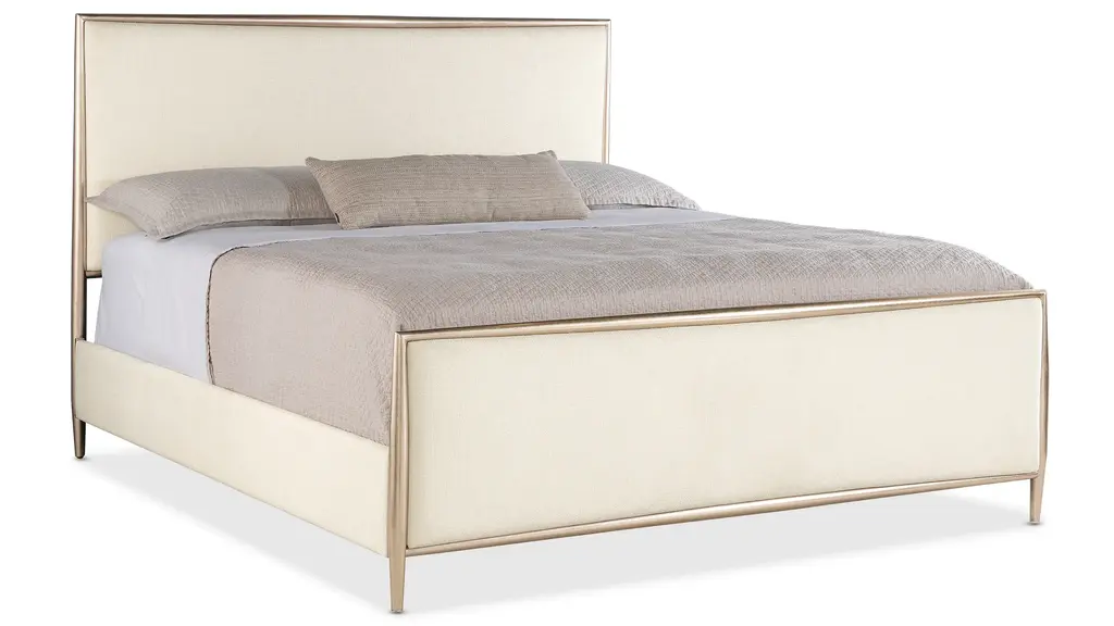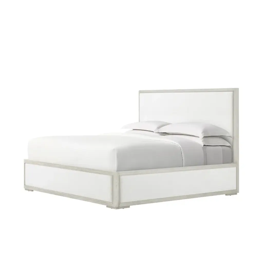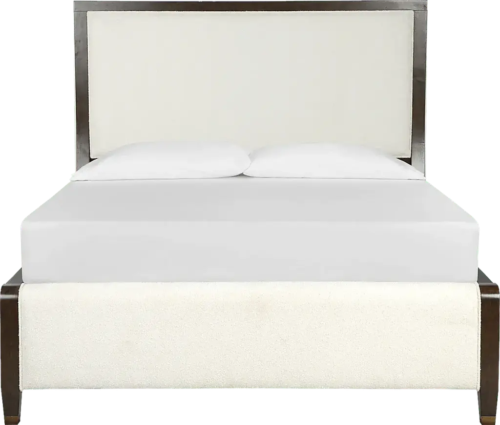 The quiet luxury of a sophisticated boutique vacation stay takes form in the Henley collection, where layers of rich texture and refined shapes anchor every corner. Rooted in contemporary style, this bed features an upholstered headboard and footboard panel in soft ivory fabric. A rich dark brown frame crafted of Mappa Burl and China birch veneers borders each panel, bringing dimension and depth through natural wood-like grain and clean lines. Mattress and foundation (if required) sold separately.