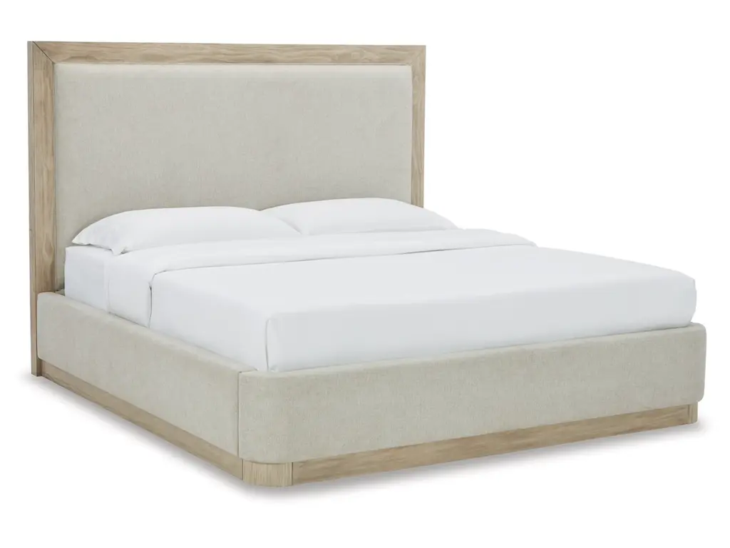 Get the luxe modern contemporary design you love at an affordable price. The Hennington king upholstered panel bed features a structured silhouette on a plinth base that elevates the piece to a modern masterpiece. Soft yet still sleek in design, this bed's side rails and footboard are cushioned and have rounded ends. The textural surface of the bisque-colored wood pairs beautifully with the neutral upholstery.
