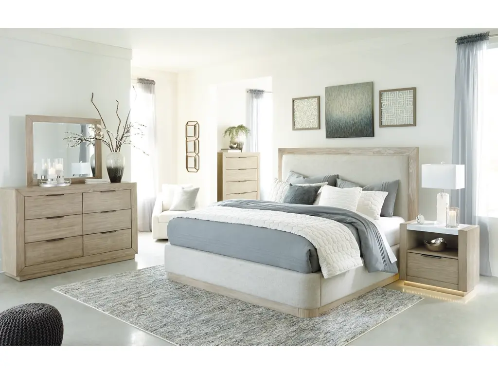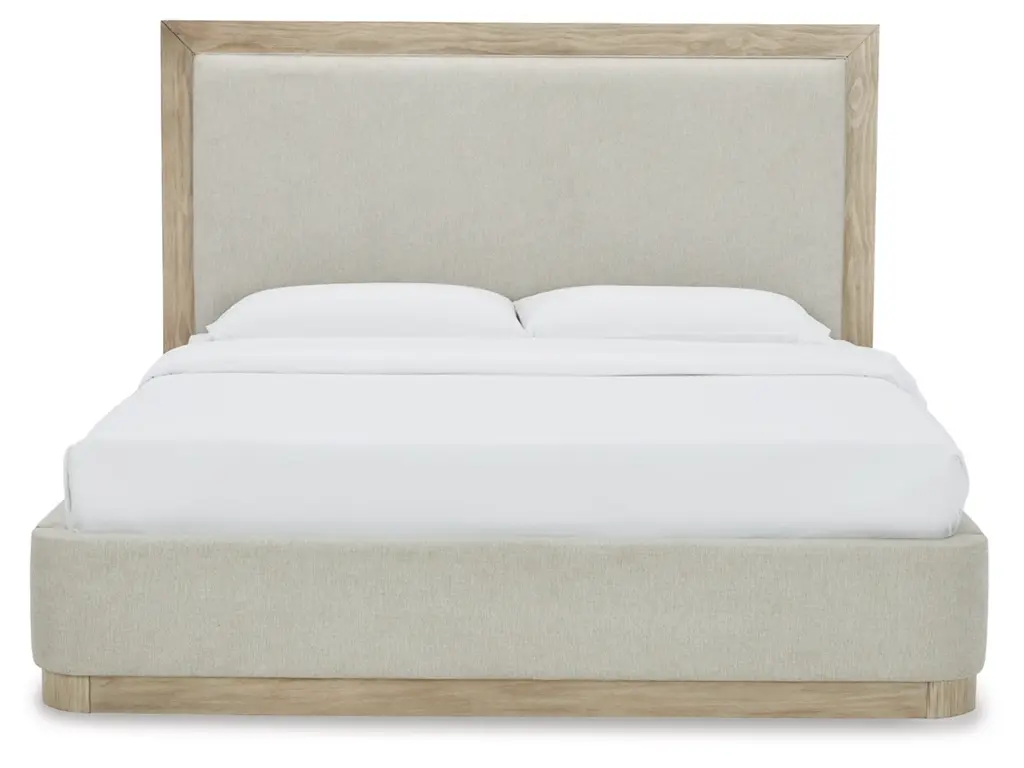Get the luxe modern contemporary design you love at an affordable price. The Hennington king upholstered panel bed features a structured silhouette on a plinth base that elevates the piece to a modern masterpiece. Soft yet still sleek in design, this bed's side rails and footboard are cushioned and have rounded ends. The textural surface of the bisque-colored wood pairs beautifully with the neutral upholstery.