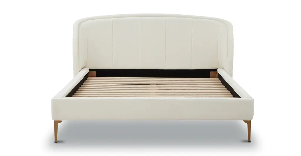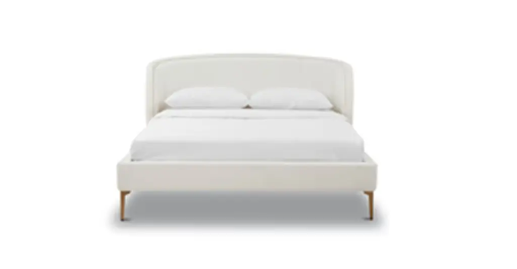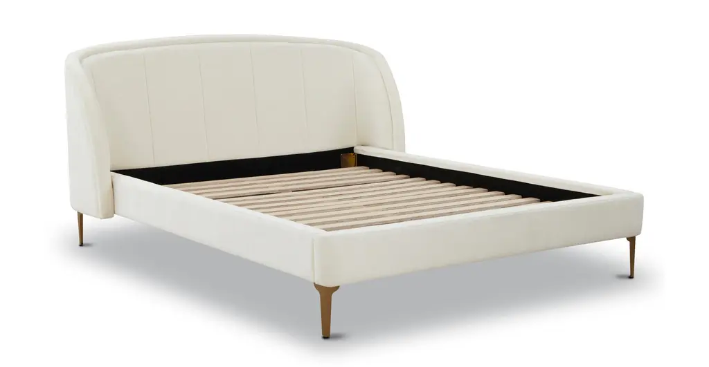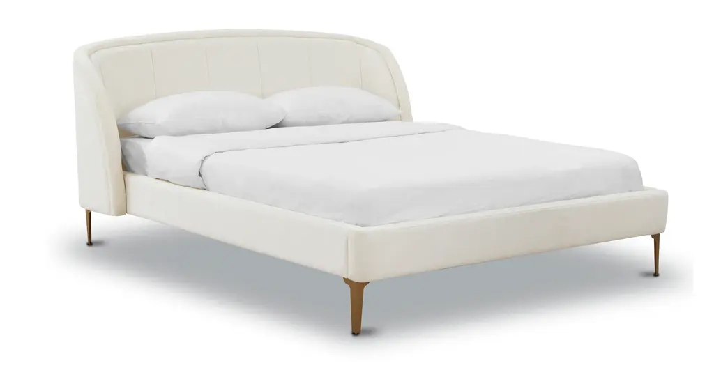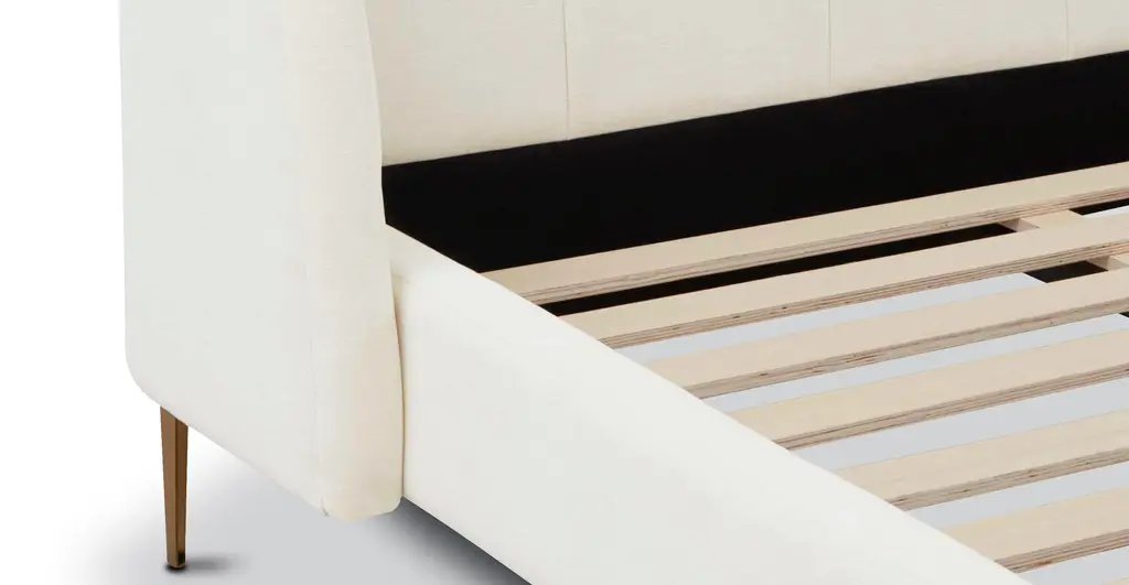 Snooze in style with our Hestia bed's wraparound headboard, embracing you like a cozy hug! Expertly upholstered in premium fabric with plush high-density foam, it's pure comfort. The brushed brass legs add a touch of glamour, while the engineered hardwood slat base with adjustable center legs ensures perfect support—no box spring needed. Sleep chic, dream sweet!