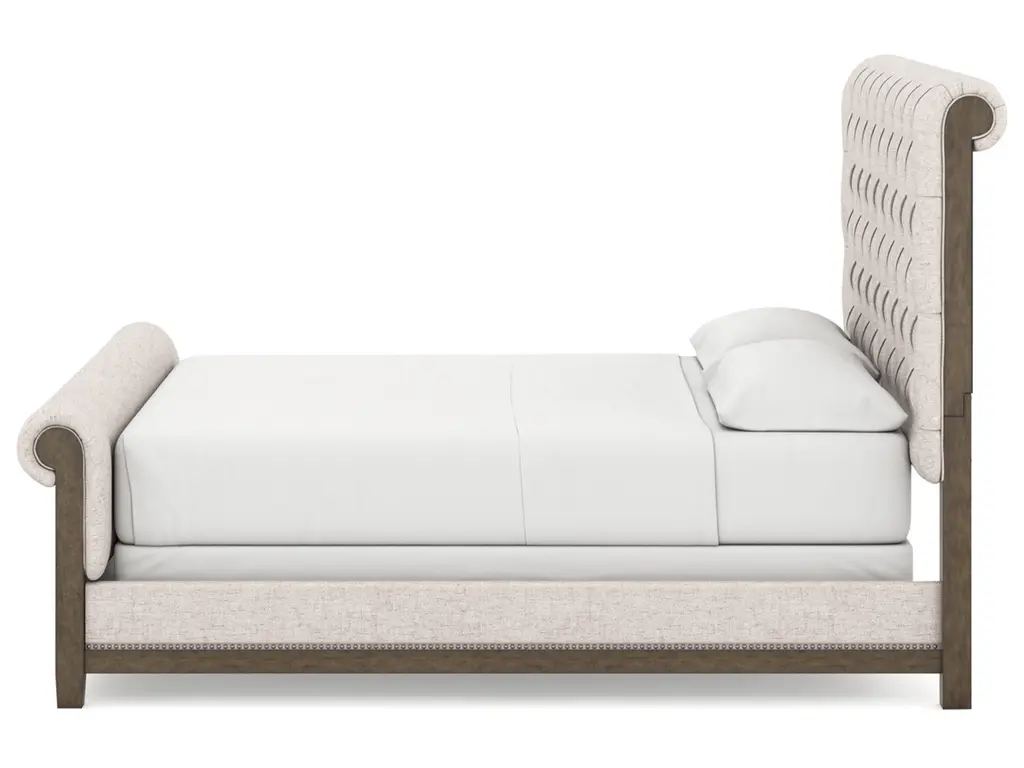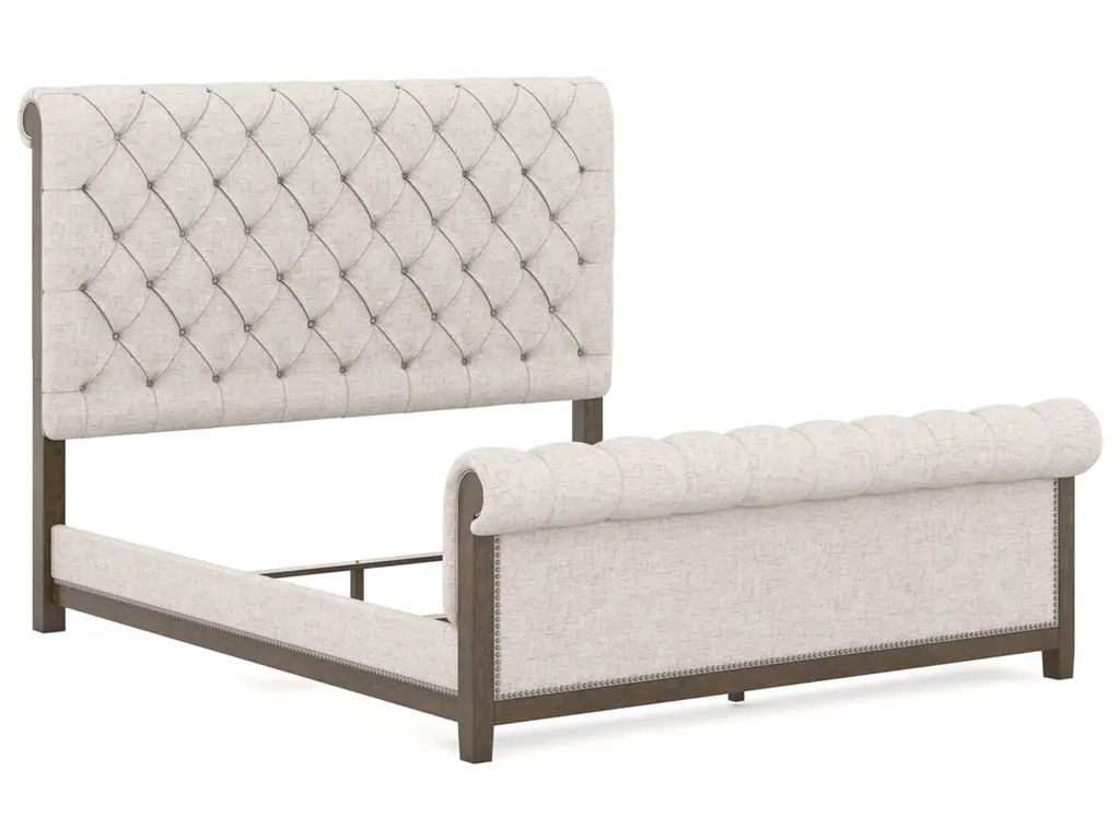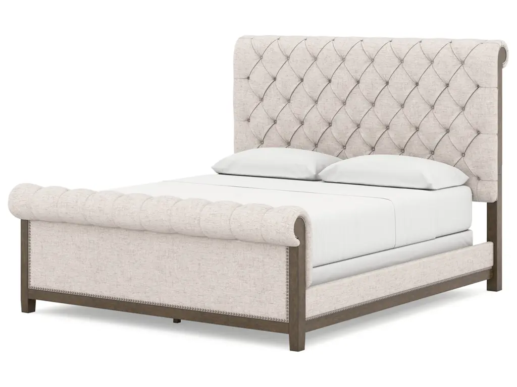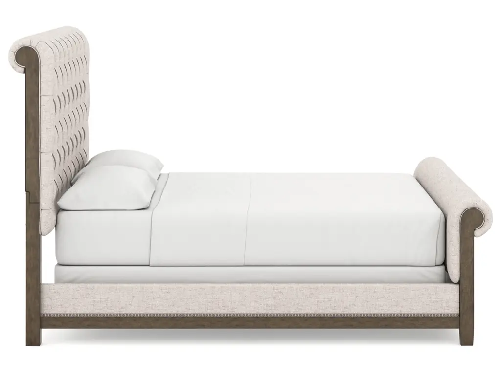 With its rich dark brown wood finish, the Hillcott California king upholstered bed gives modern farmhouse styling a substantial sensibility. Exaggerated rolled tops on the headboard and footboard are enhanced with beautiful tufting and nailhead trim. Subtle touches elevate this bed into a statement piece that’s timeless, functional and versatile.
