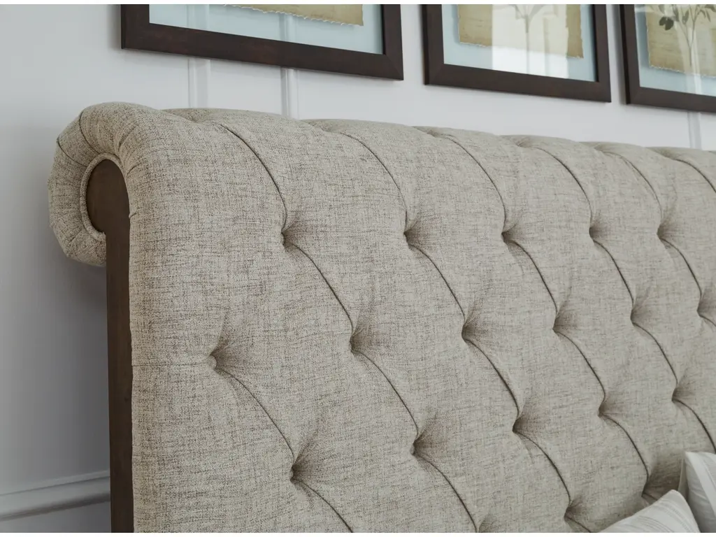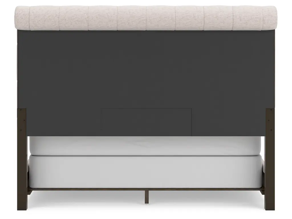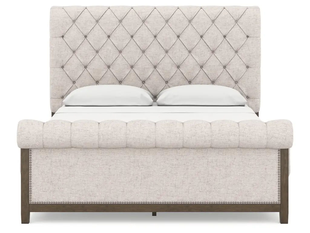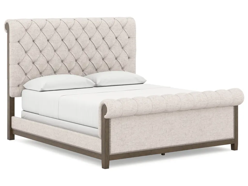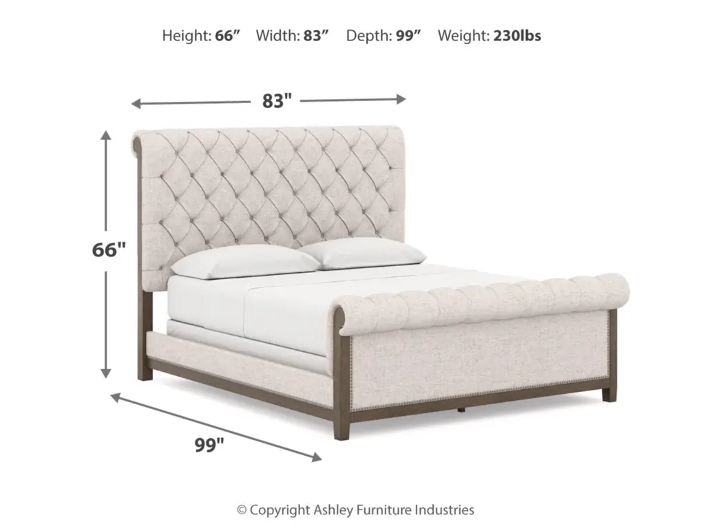With its rich dark brown wood finish, the Hillcott California king upholstered bed gives modern farmhouse styling a substantial sensibility. Exaggerated rolled tops on the headboard and footboard are enhanced with beautiful tufting and nailhead trim. Subtle touches elevate this bed into a statement piece that’s timeless, functional and versatile.