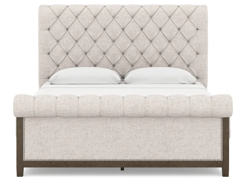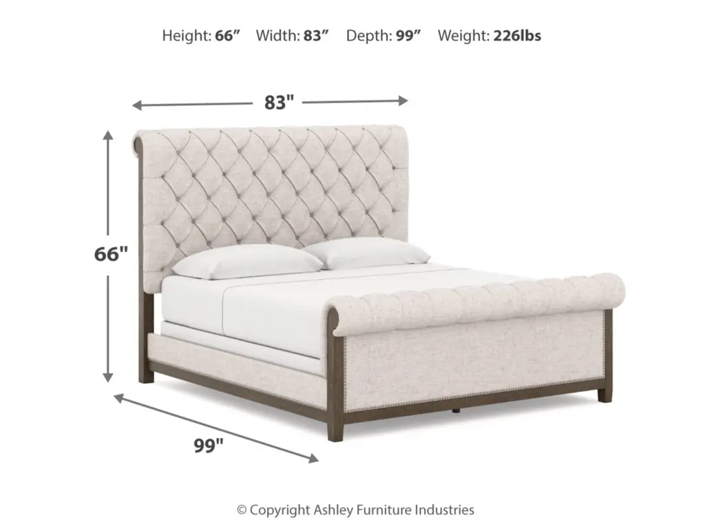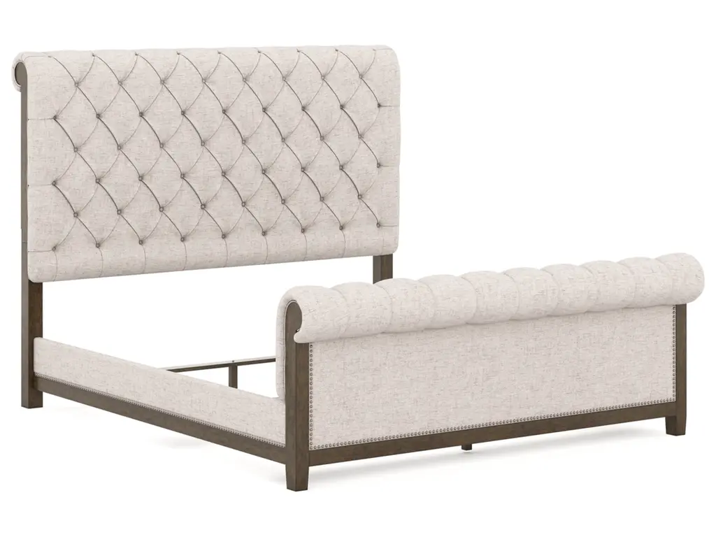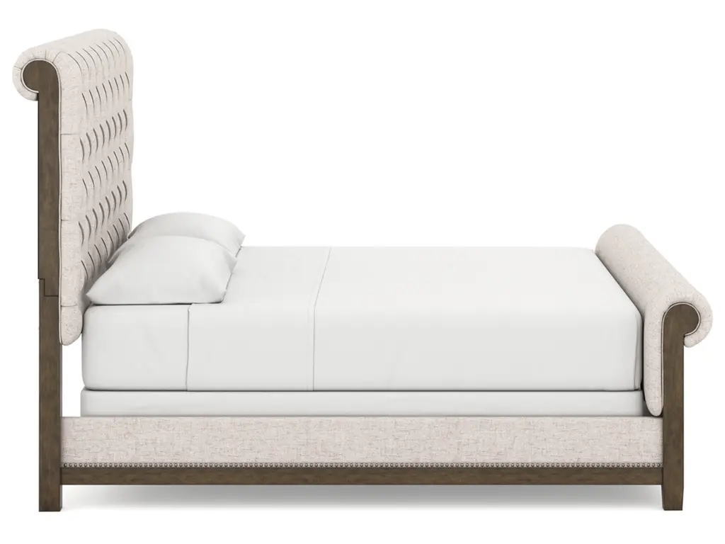 With its rich dark brown wood finish, the Hillcott king upholstered bed gives modern farmhouse styling a substantial sensibility. Exaggerated rolled tops on the headboard and footboard are elevated with beautiful tufting and nailhead trim. Subtle touches elevate this bed into a statement piece that’s timeless, functional and versatile.