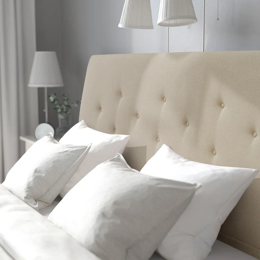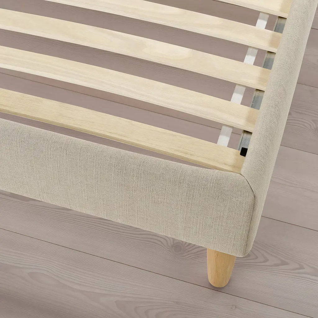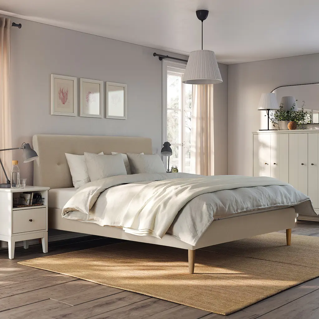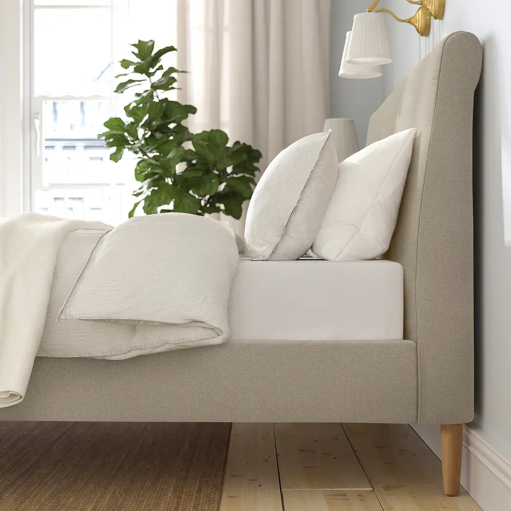 IDANÄS Upholstered bed frame - Naggen beige King. IDANÄS upholstered bed frame has a thick, sloping headboard that provides comfortable support for your back - perfect for lazy mornings and long evenings when reading a newspaper or a thrilling book in bed. Mattress and bedlinens are sold separately.