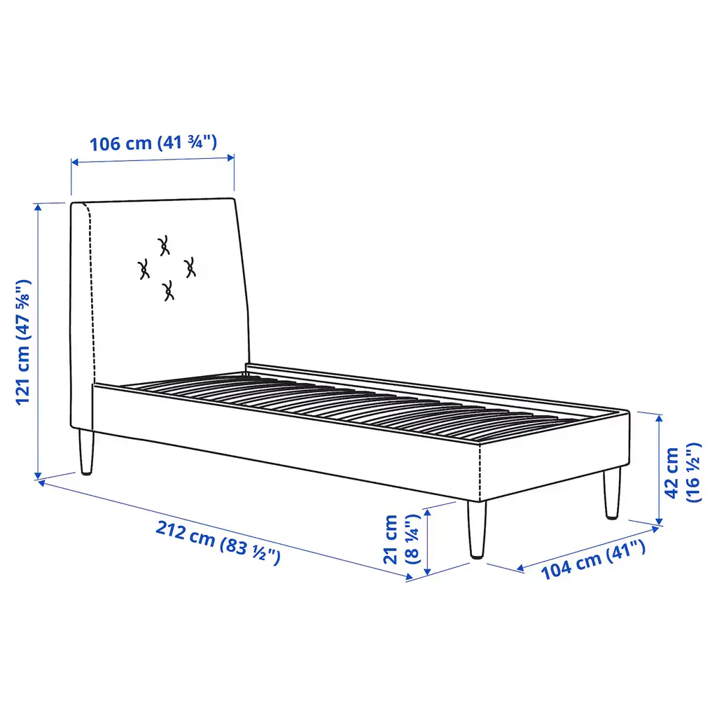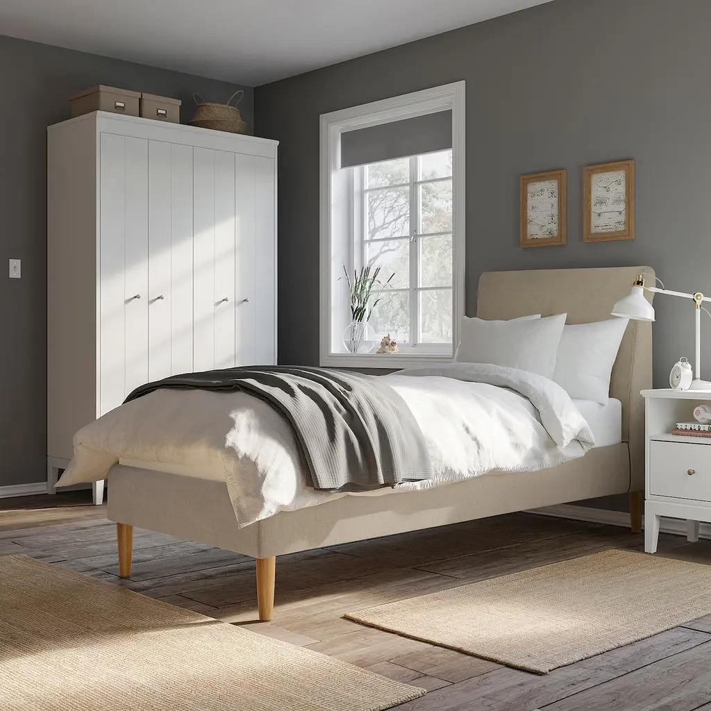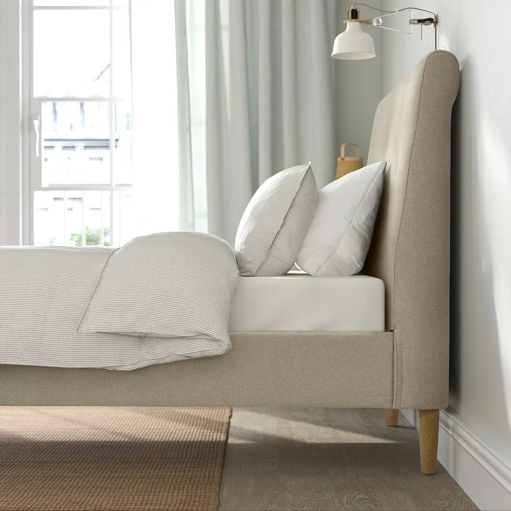 IDANÄS Upholstered bed frame - Naggen beige Twin. IDANÄS upholstered bed frame has a thick, sloping headboard that provides comfortable support for your back - perfect for lazy mornings and long evenings when reading a newspaper or a thrilling book in bed. Mattress and bedlinens are sold separately.