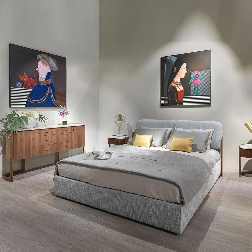 Distilling timeless refinement, this Canaletto walnut double bed effortlessly synthesizes functionality and elegance. The storage design makes it perfect for complementing compact bedrooms, while its distinctive slatted and curved back suggests its display away from walls to be fully admired. Part of the Italo Collection, it includes a frame and upholstered bed base. Mattress is not included.