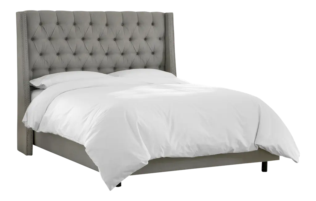 This Upholstered Bed brings hotel luxury to your bedroom. Crafted by hand, the headboard is designed with deep button-tufting and two rows of nailhead accents along the wings. A stately and stylish addition to any master or guest suite. Includes upholstered headboard, upholstered side rails, and standard metal bed frame, Handcrafted in Illinois This item is made to order.