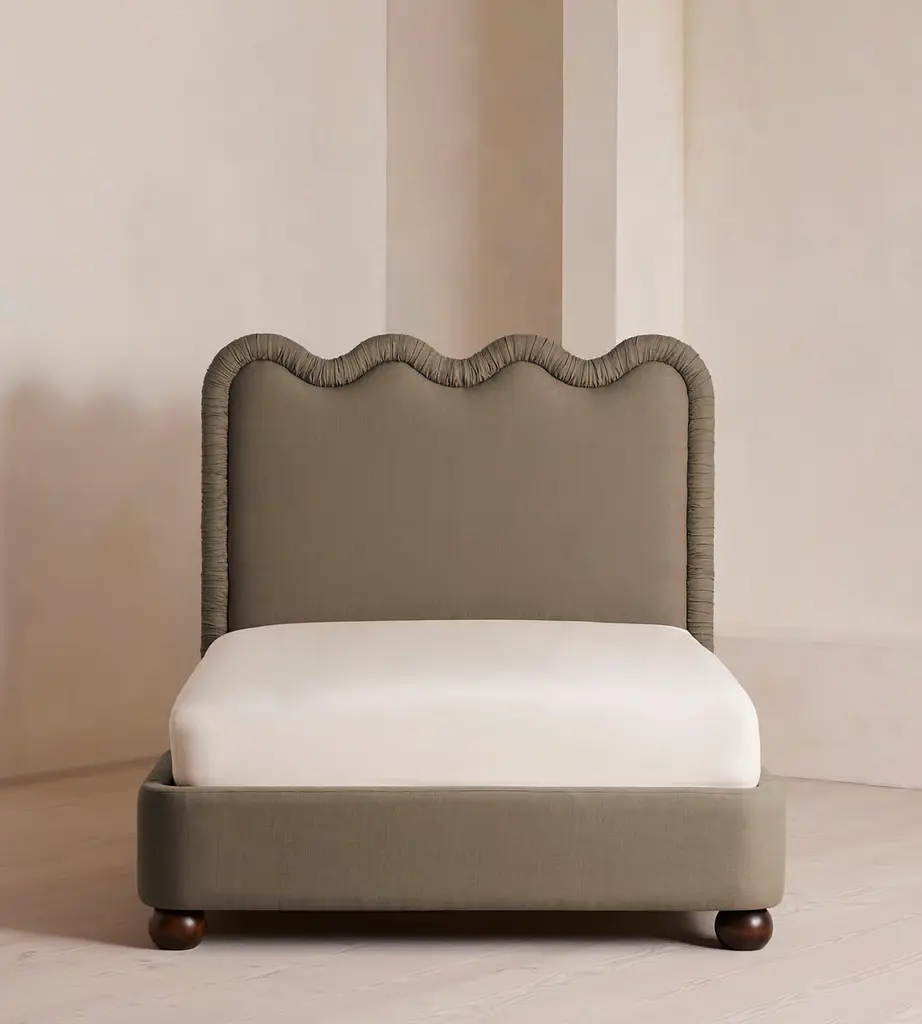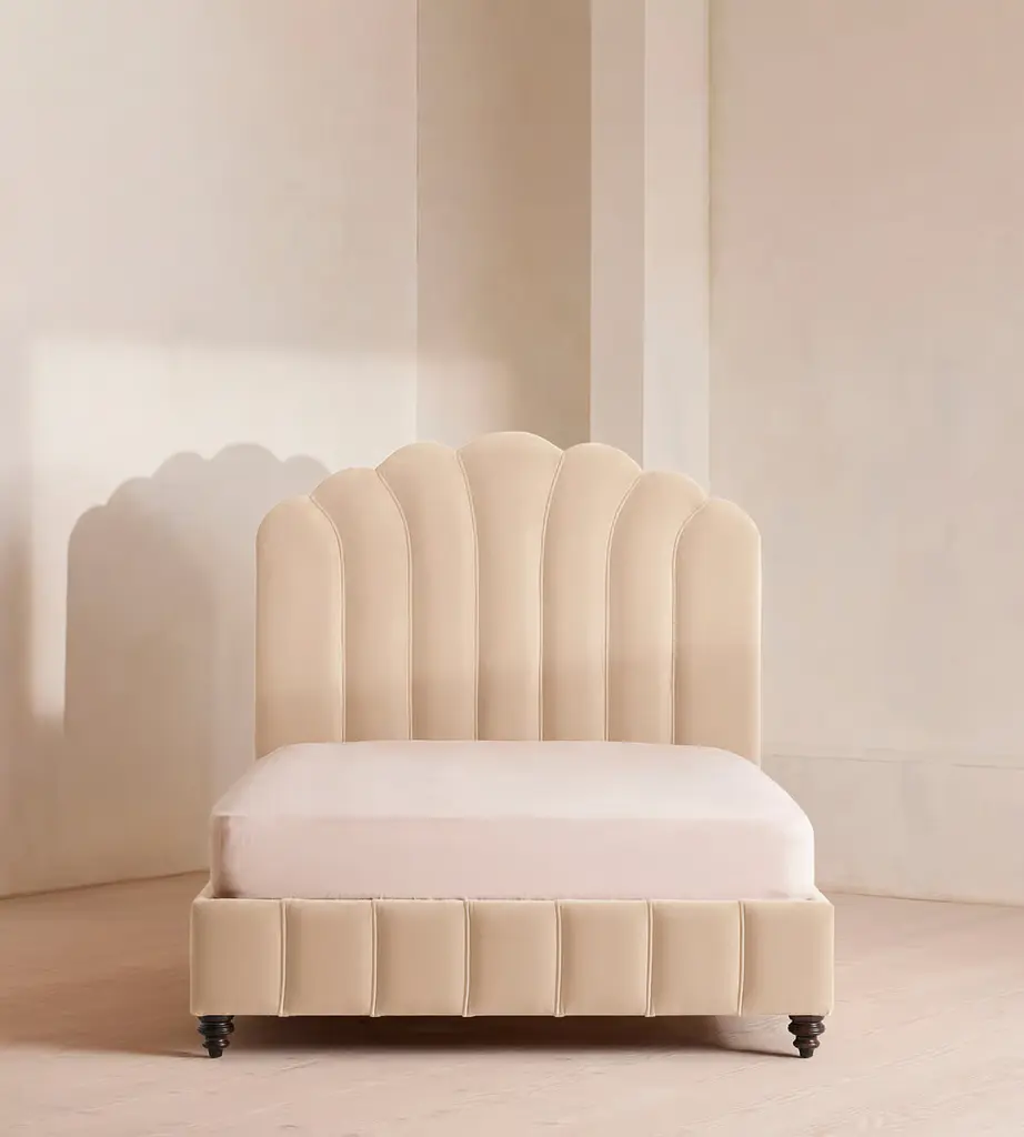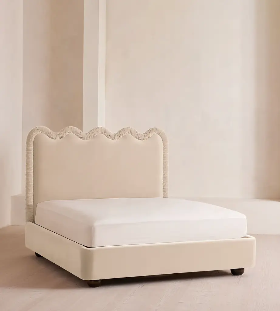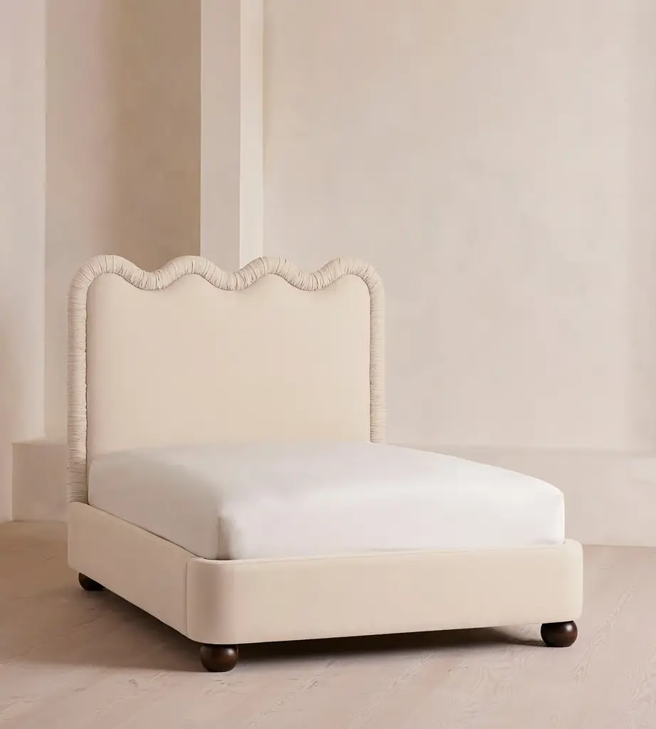 The Jacqueline bed embraces a Provençal-inspired design with a gently waved headboard and footboard, fully upholstered in cream. Geometric stacked legs of solid ash add a contemporary twist to traditional charm. Meticulously crafted with a padded headboard, this bed offers both comfort and durability, transforming the bedroom into a haven of tranquility.