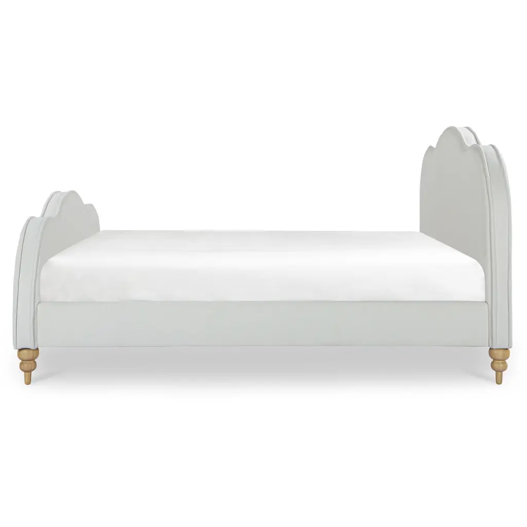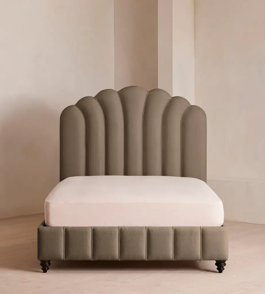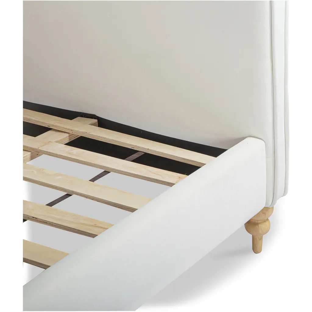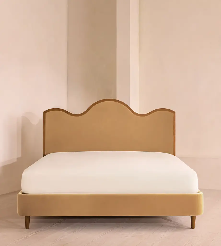 The Jacqueline bed embraces a Provençal-inspired design with a gently waved headboard and footboard, fully upholstered in cream. Geometric stacked legs of solid ash add a contemporary twist to traditional charm. Meticulously crafted with a padded headboard, this bed offers both comfort and durability, transforming the bedroom into a haven of tranquility.