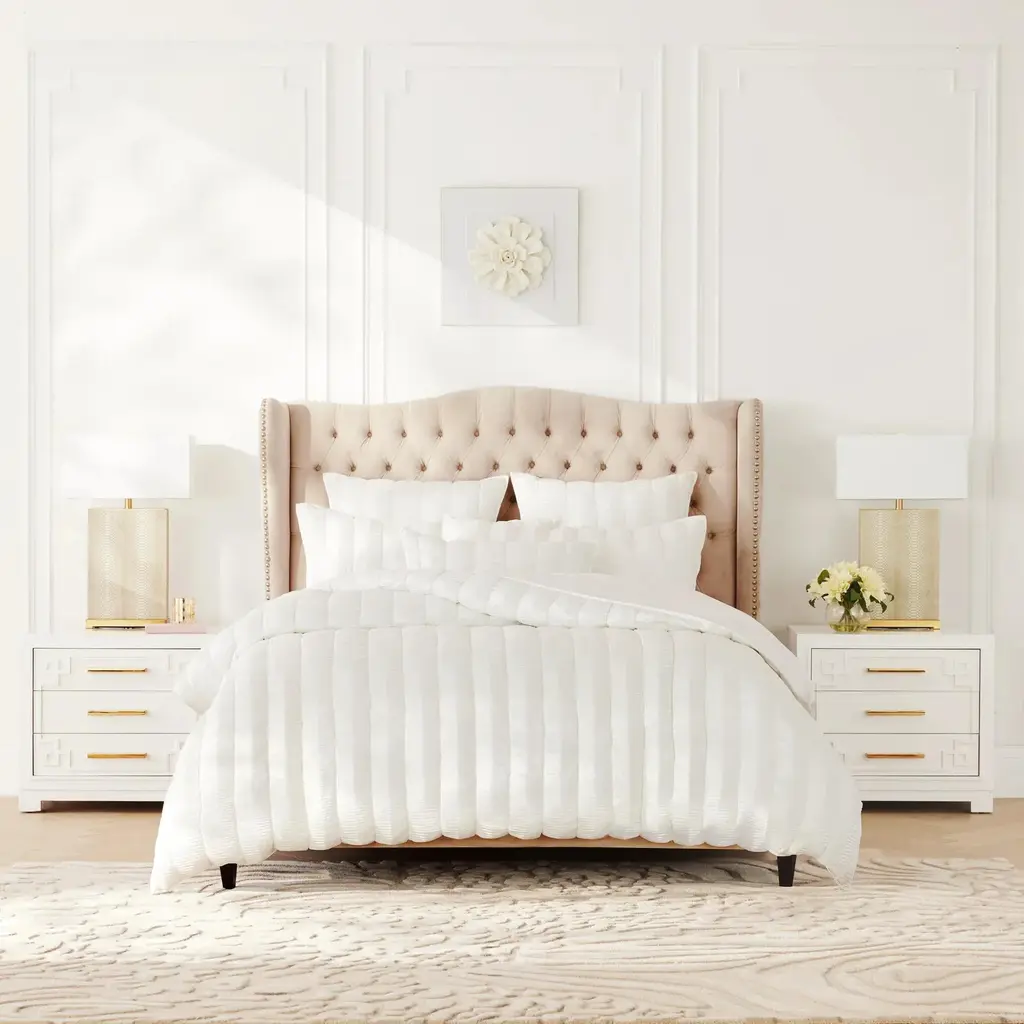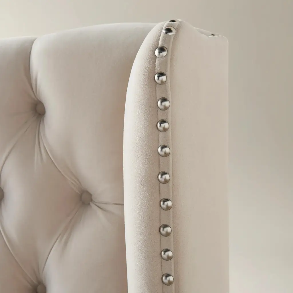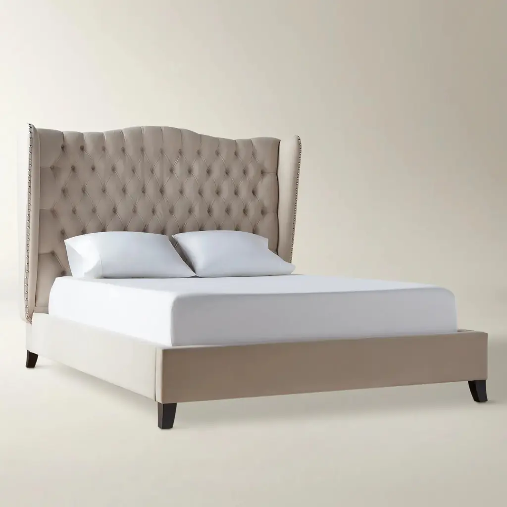 With its graceful camelback silhouette, deep, hand-applied button tufts, and plush padding, you’ll rest luxuriously in our Jameson Bed. Trimmed with decorative nailheads, its winged sides and considerable height add a sense of opulence and drama to the bedroom. Shown in Bella Velvet Pearl with brushed silver nailheads.Exclusive to Z GallerieCustom options available including over 30 fabrics. Custom Orders: Custom Furniture is manufactured especially for you, which is why we do not accept cancellations, exchanges, or returns.