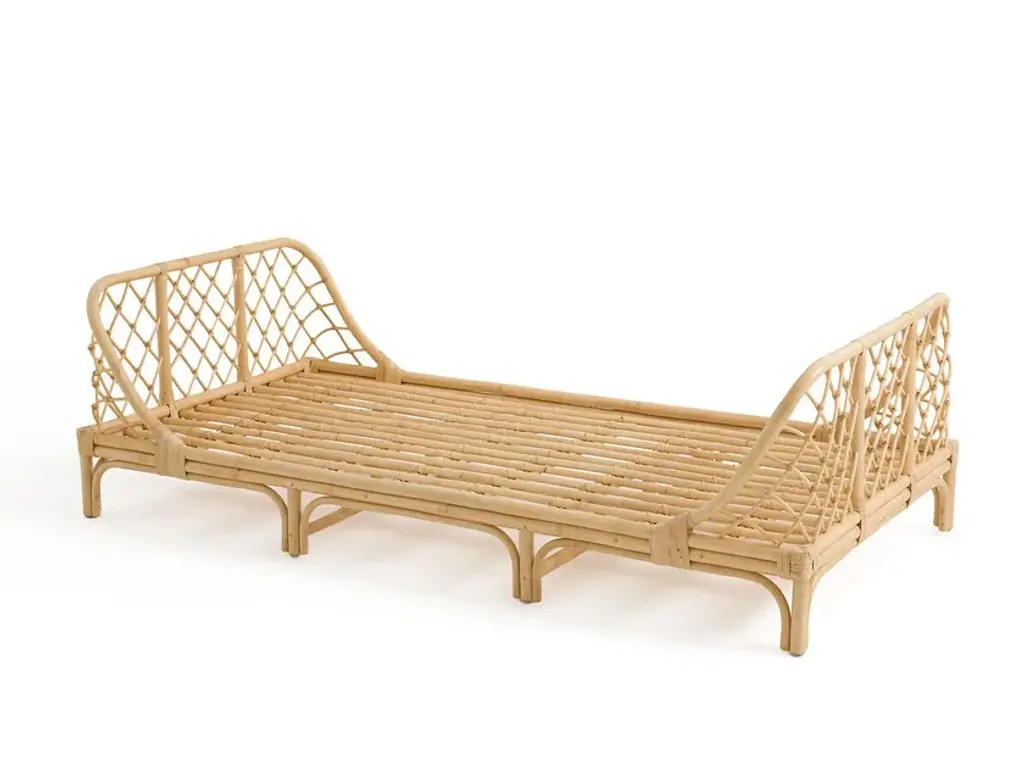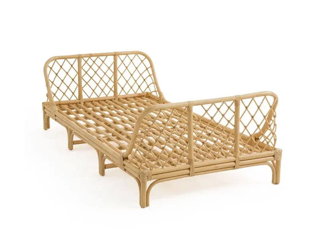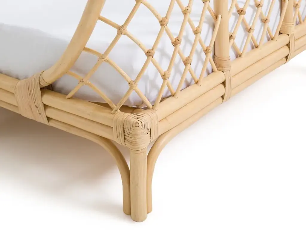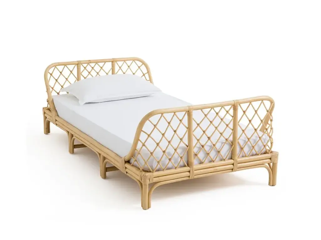 KATSUKI bedroom bed: a wicker children's bed, basket shape, vintage spirit, with soft, enveloping lines.Description:In natural finish wickerHeadboard and bed feet with criss-cross patternWicker bed base included8 feet for total stabilityBed linen 90 x 190 cm, mattress sold on siteDelivered assembled