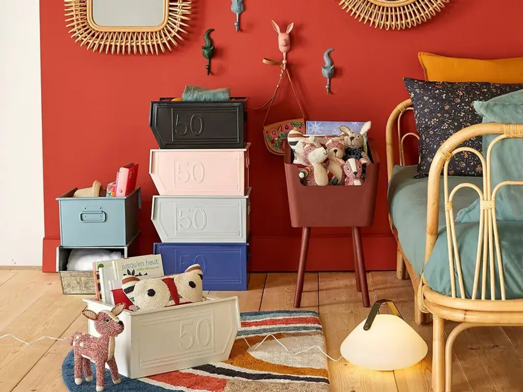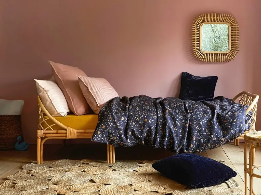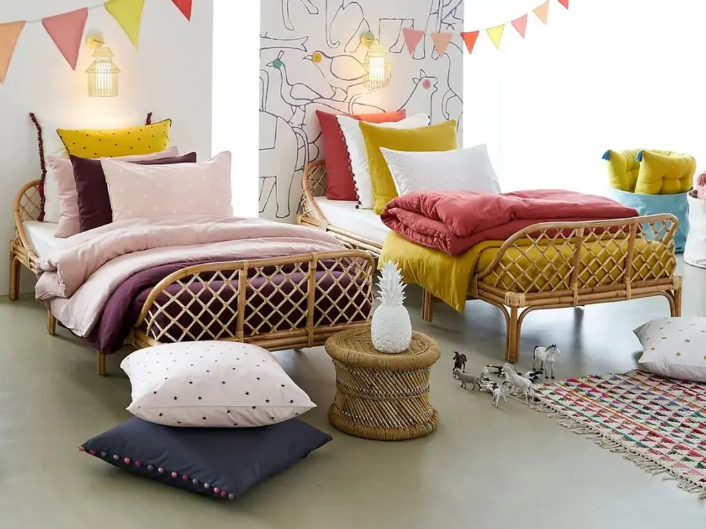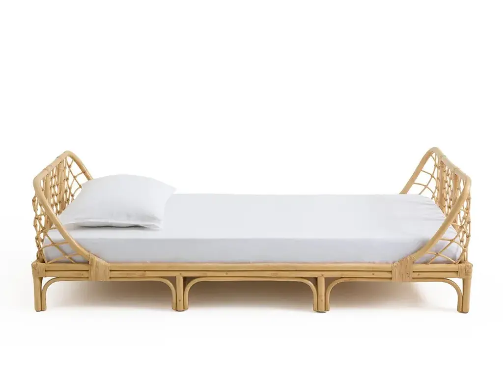 KATSUKI bedroom bed: a wicker children's bed, basket shape, vintage spirit, with soft, enveloping lines.Description:In natural finish wickerHeadboard and bed feet with criss-cross patternWicker bed base included8 feet for total stabilityBed linen 90 x 190 cm, mattress sold on siteDelivered assembled