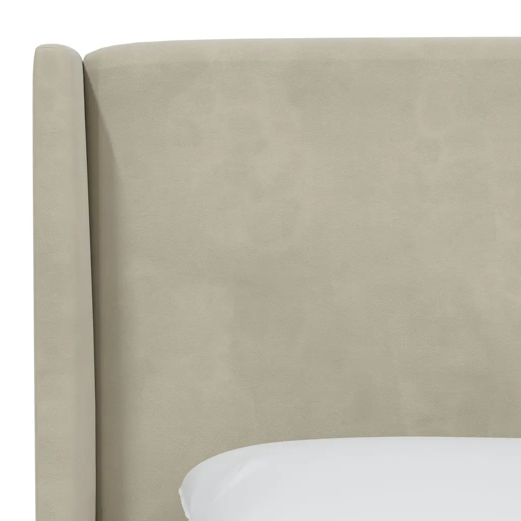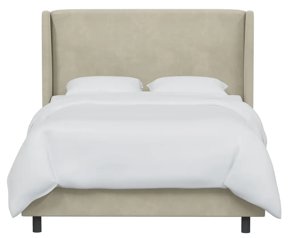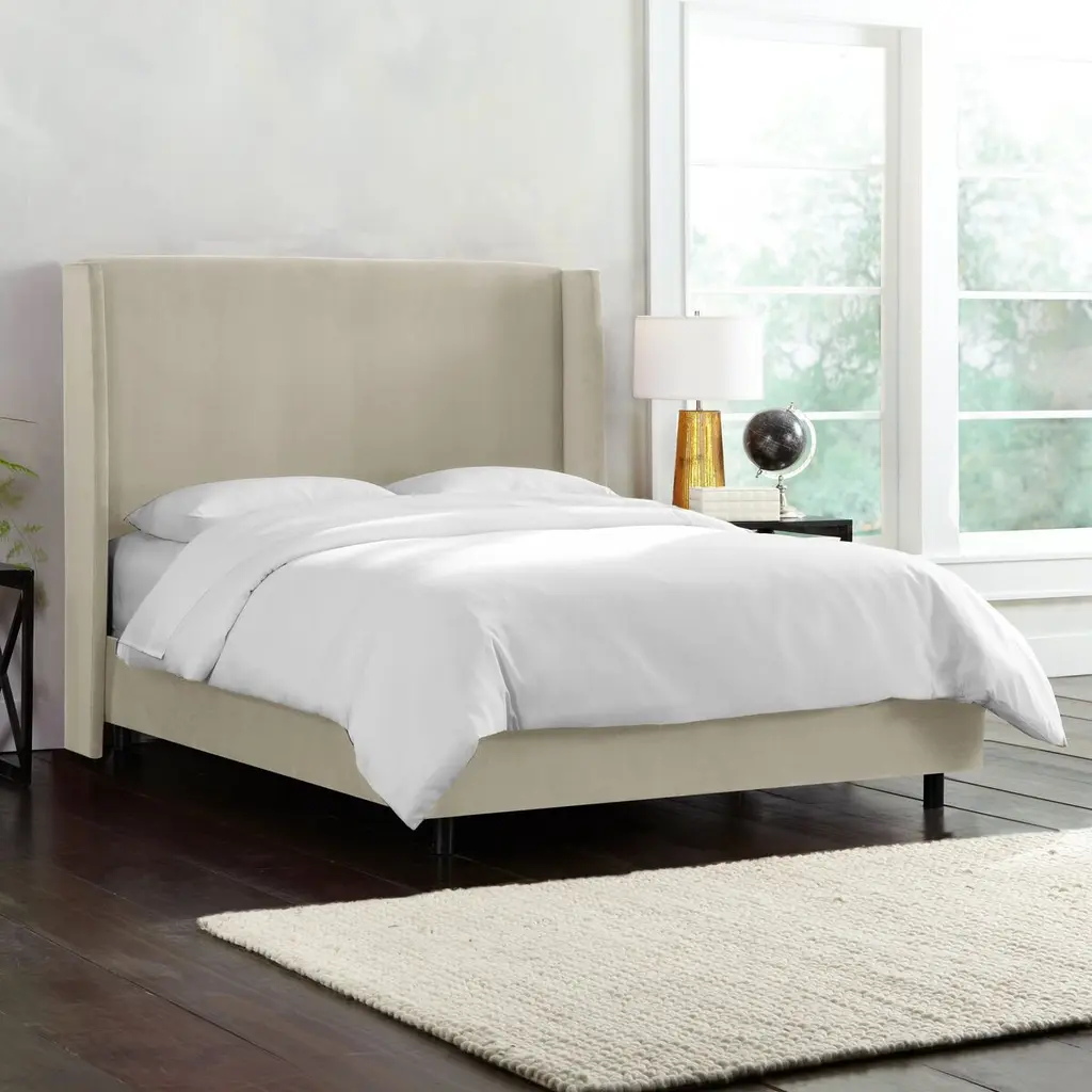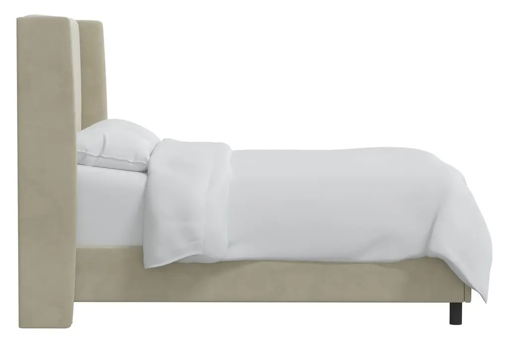 Simple, textural, and modern, this wingback bed is upholstered in midnight-blue velvet. Mattress and box spring required. Handcrafted in the USA.