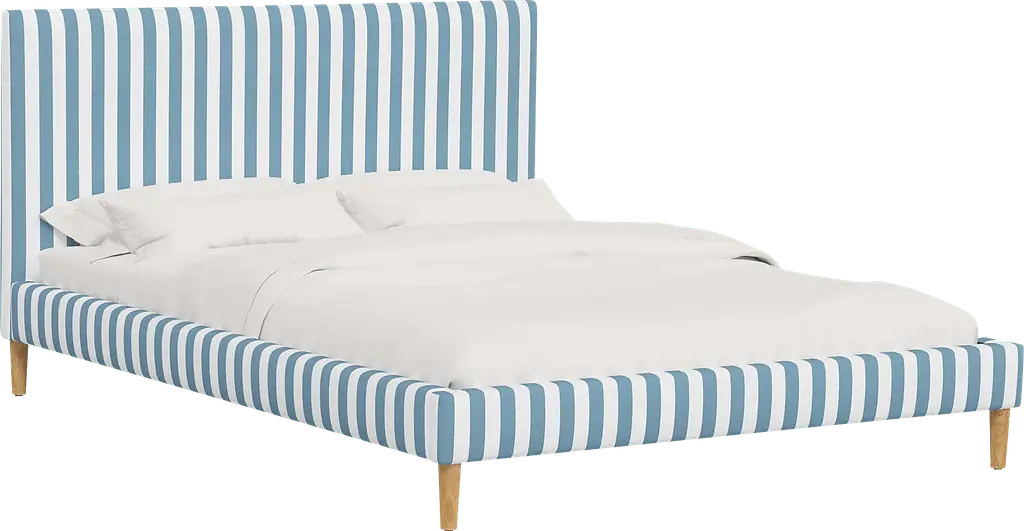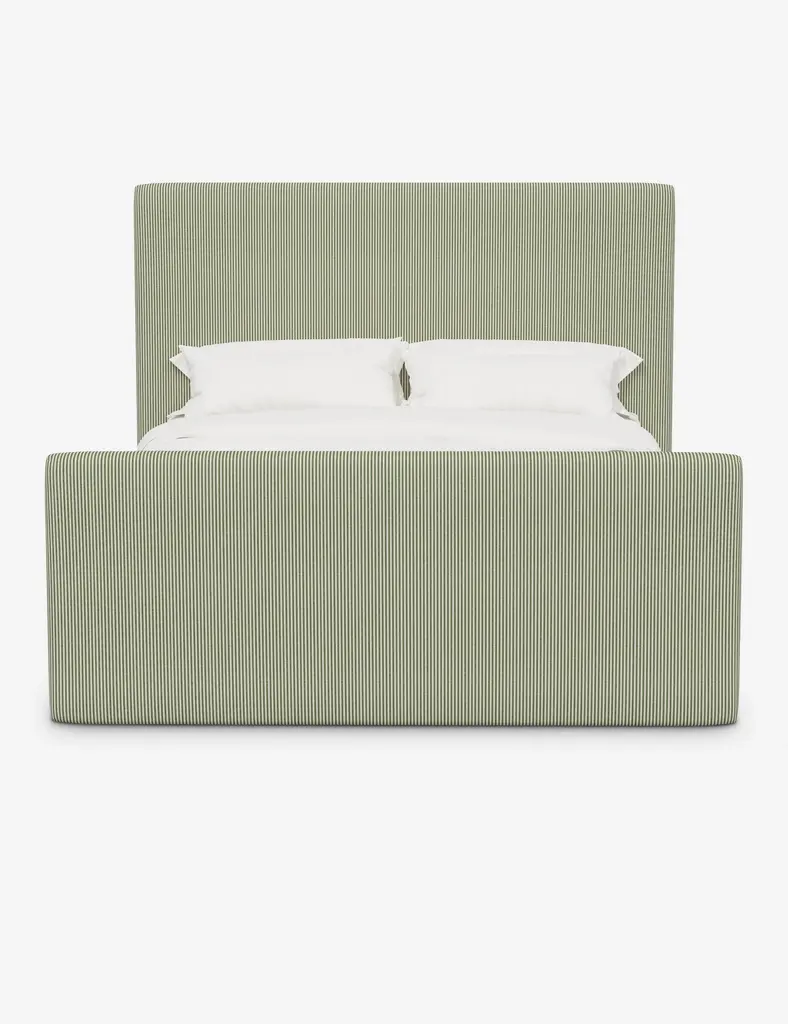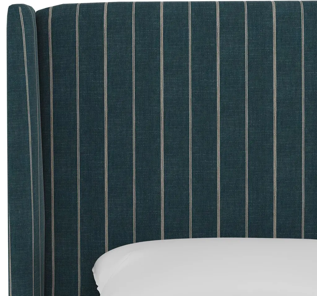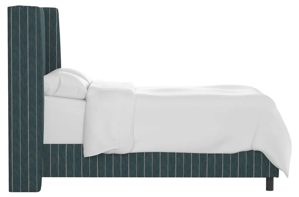 This wingback bed is crafted of pine with a clean-lined silhouette and striped cotton-linen-blend upholstery. We especially love how its ample padding ensures soft, study support while reading or watching TV in bed. Mattress and box spring required. Handcrafted in the USA.
