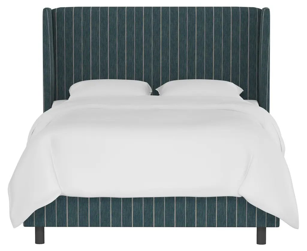 This wingback bed is crafted of pine with a clean-lined silhouette and striped cotton-linen-blend upholstery. We especially love how its ample padding ensures soft, study support while reading or watching TV in bed. Mattress and box spring required. Handcrafted in the USA.