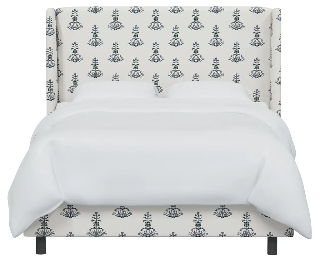 Exclusive to One Kings Lane: Upholstery in a pattern inspired by Indian block prints adds to the glamour of this wingback bed. Generous headboard padding ensures long-lasting comfort and support while sitting up to read or watch TV. Mattress and box spring required.