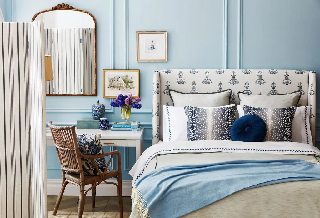 Exclusive to One Kings Lane: Upholstery in a pattern inspired by Indian block prints adds to the glamour of this wingback bed. Generous headboard padding ensures long-lasting comfort and support while sitting up to read or watch TV. Mattress and box spring required.