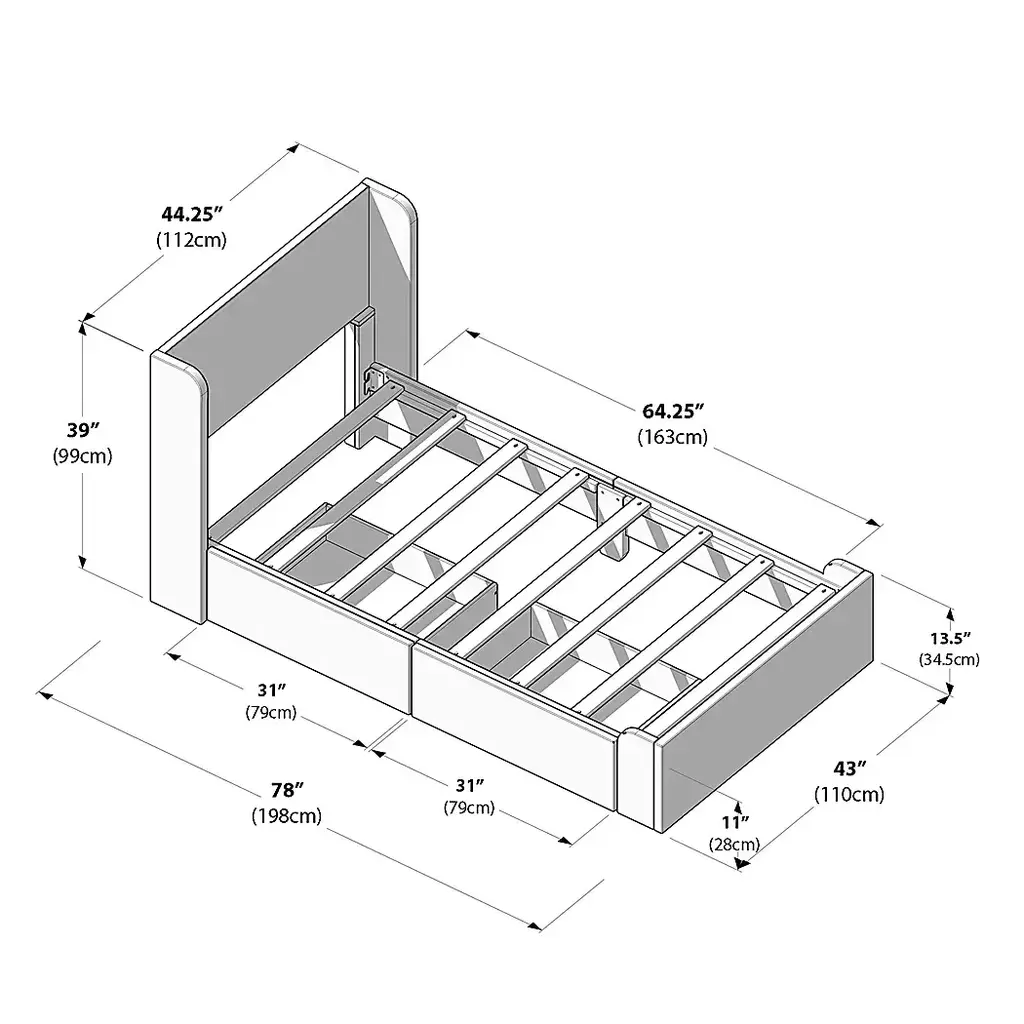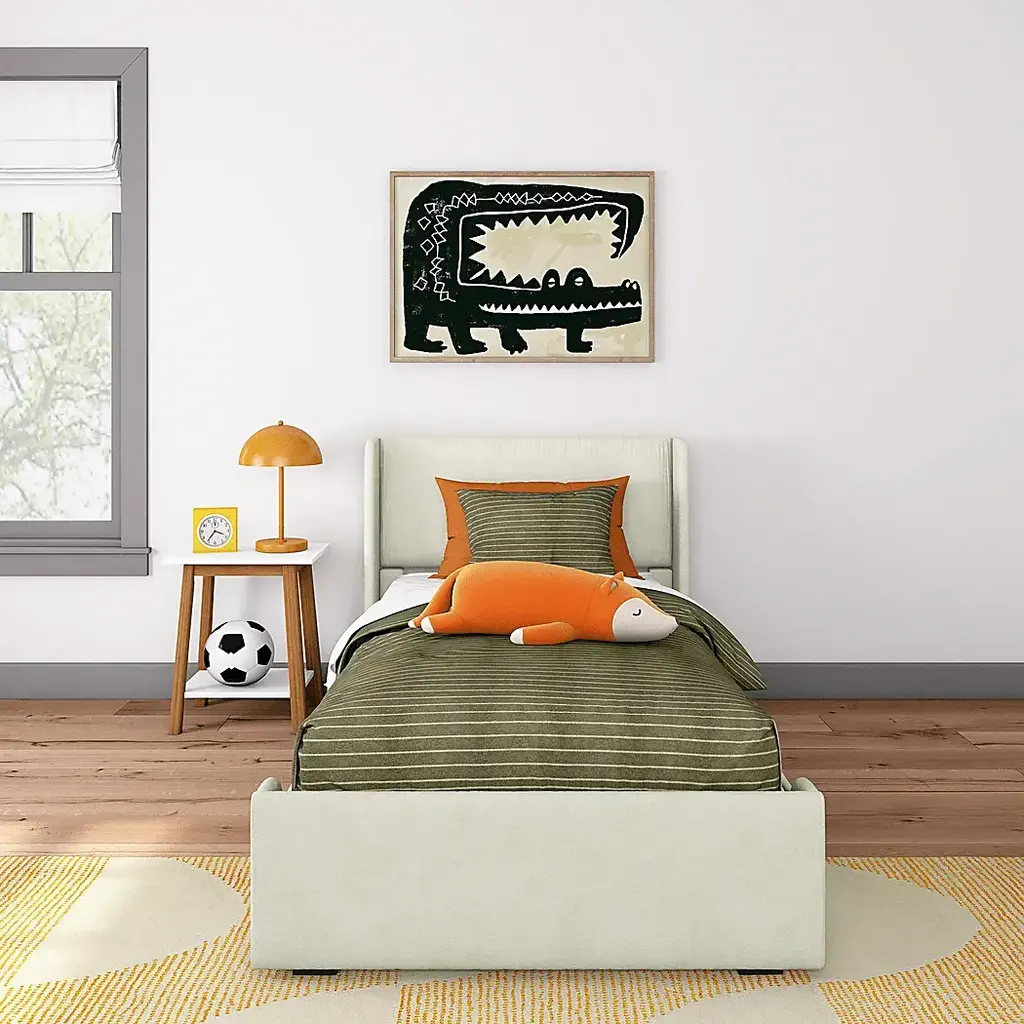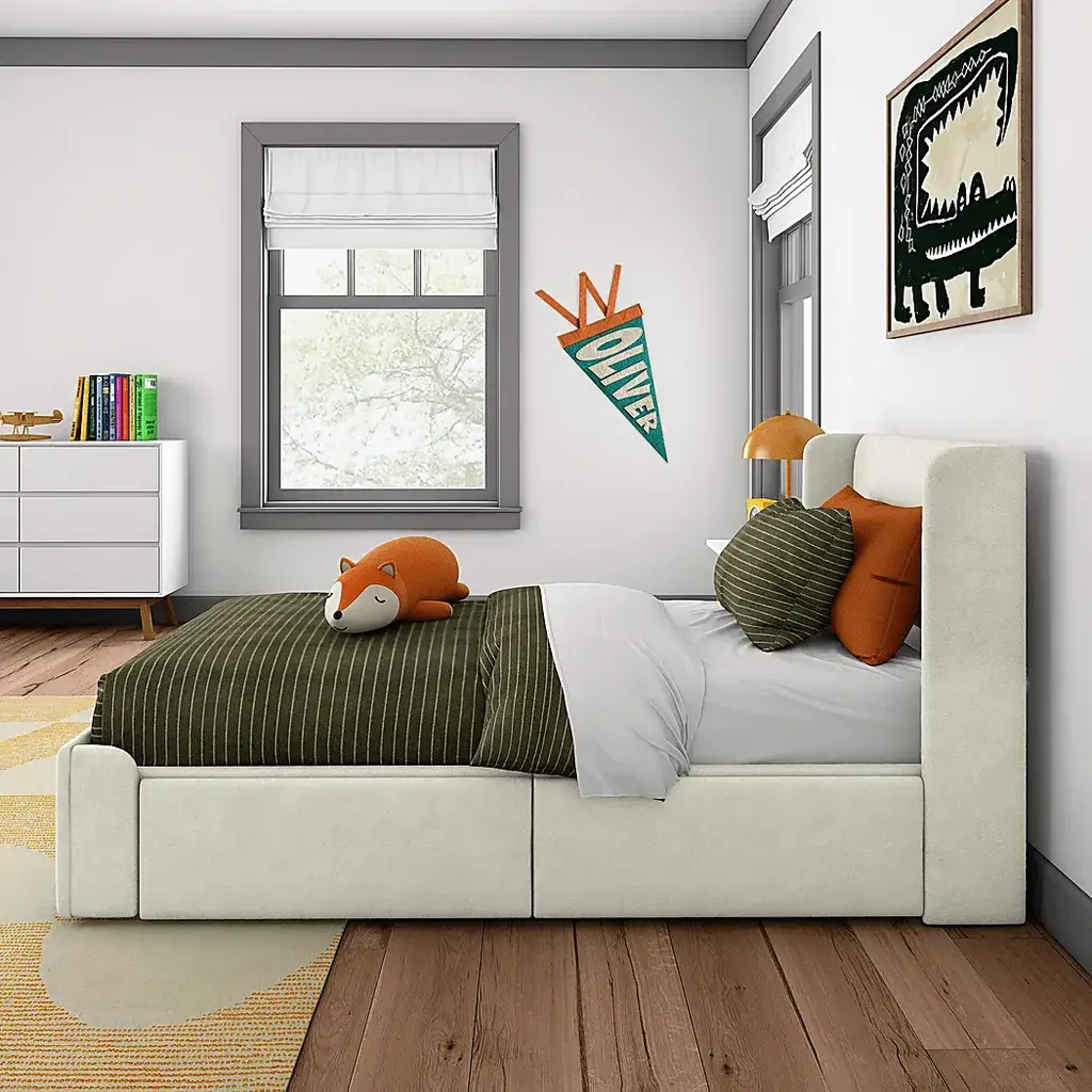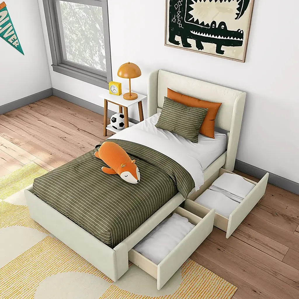 Create the room of your child's dreams with the Evosa Upholstered Twin Bed with Storage. Built from knot-free solid pine and sturdy engineered wood, this twin bed offers long-lasting strength and stability. Soft chenille upholstery in fun colors and a padded headboard make it as cozy as it is stylish. Sturdy plywood slats support up to 400 lbs, while metal-on-metal connections ensure durability over time. Optional storage drawers slide easily on either side, perfect for organizing toys, bedding, or clothes. Easy to clean - all it requires is a simple spot clean. Customer assembly is required.