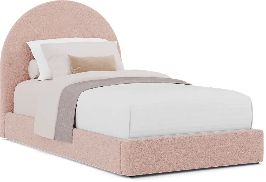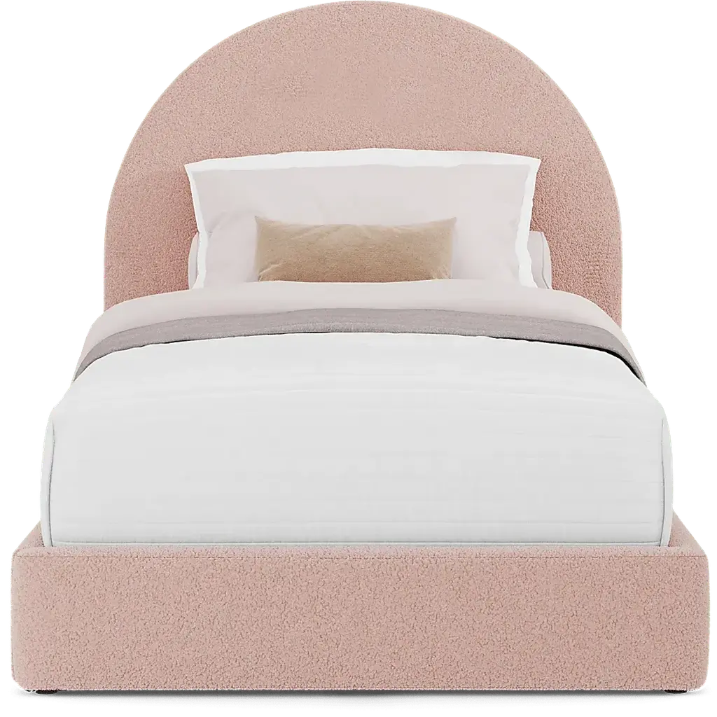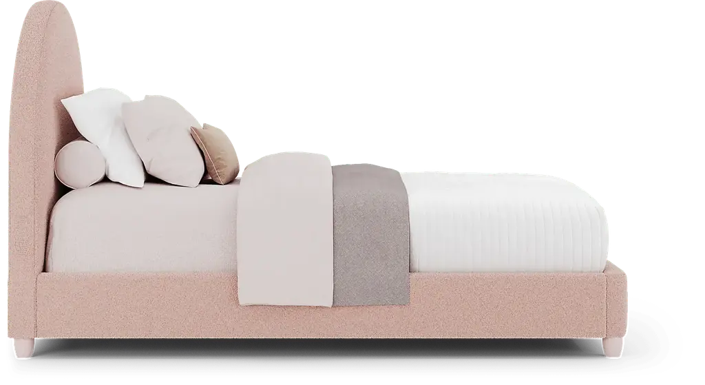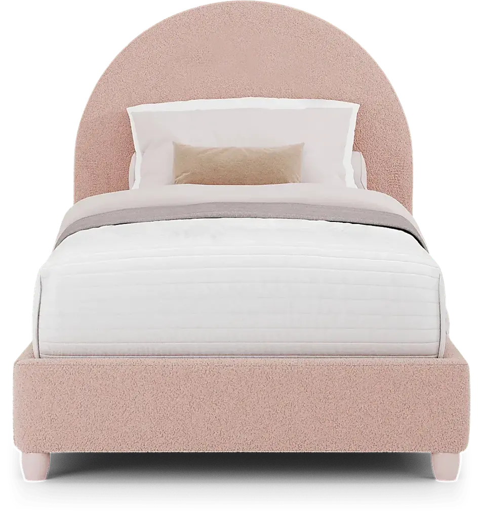 You'll be over the moon for the simply modern style of the Moonstone bed. Fully upholstered with soft boucle fabric, the focal point of the piece is the signature half-moon arch of the headboard. Crafted with hardwood solids, this twin bed features a Montessori-style, wraparound frame that's low to the ground and sits on base glides. This set also includes turned wood legs to better fit your loved one's growing needs. The pink feet are painted to match the precious color of the upholstery. Mattress and foundation (if required) sold separately. Bunkie board is required for this product (sold separately.) Upholstery: 100% polyester