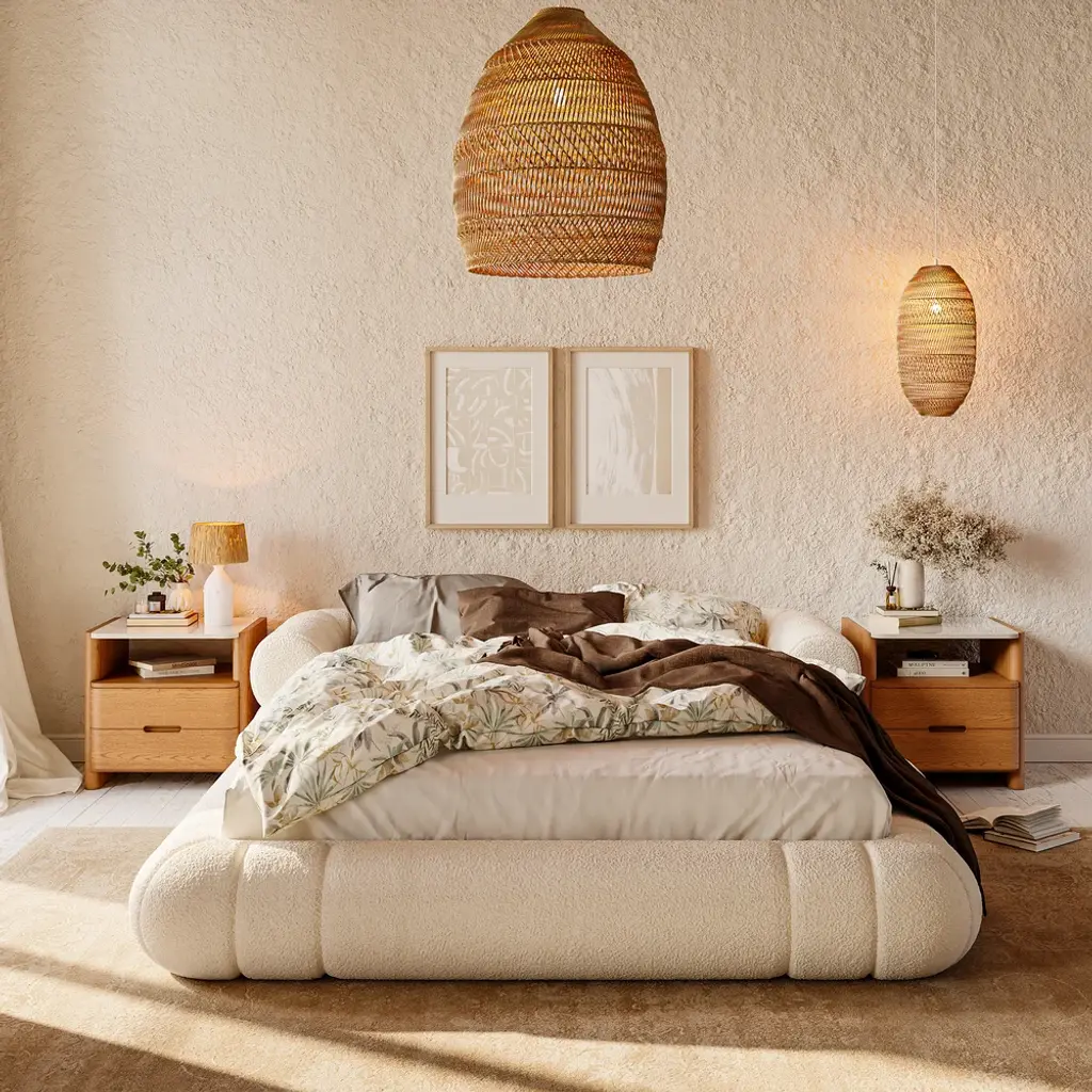 Add modern elegance to your bedroom with this low-profile boucle bed. Plush, no-shed fabric provides comfort and warmth, while the circular headboard adds a stylish, practical touch.
