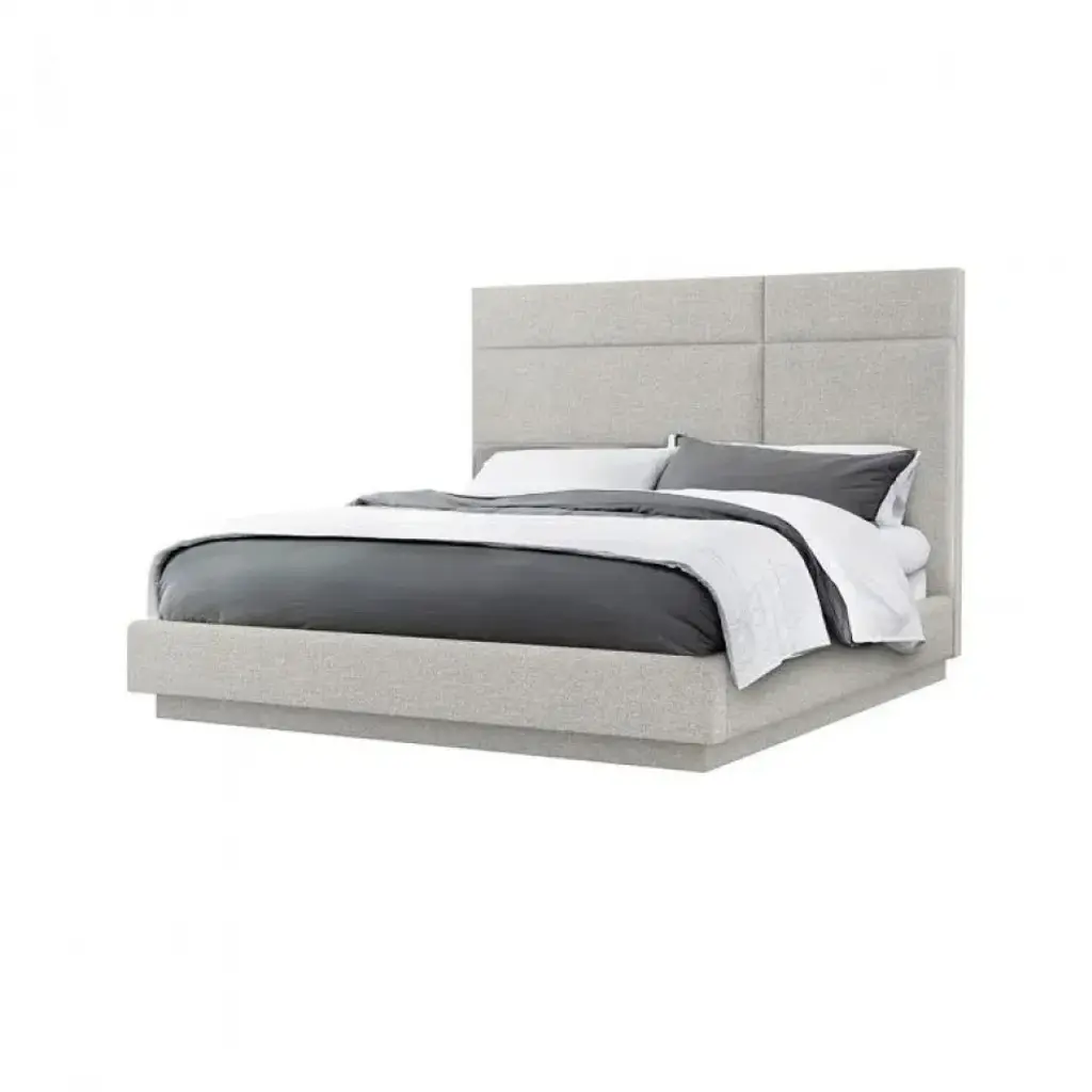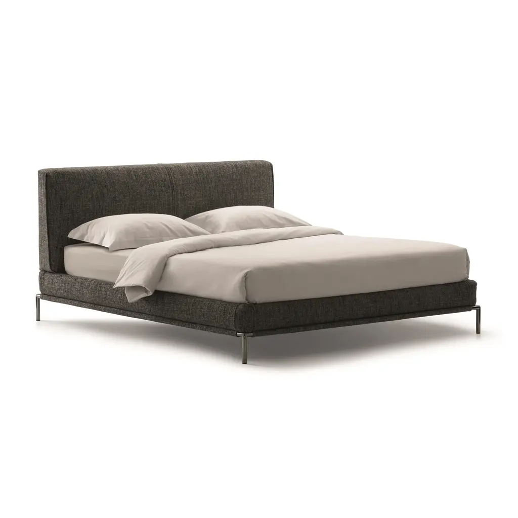 King size Margot bed by DomkapaDimensions: W 218 x D 236 x H 91.5 cm.Materials: Black texturized steel, microfiber (Tarn 08).Also available in different materials.Margot bed is a highly innovative bedroom solution linked to functional and essential shapes, resulting in a unique upholstered piece. The wide and enveloping headboard, with its soft lines and quality details, is divided into two padded sets to favor moments of rest in both domestic settings and public venues. The stunning metallic tubing and feet enhance the beauty of this piece from Domkapa’s 2022 collection.With a minimal and distinctive style, Margot bed promises to embrace every detail of your project and intensify them for the perfect decor.Domkapa holds a tremendous passion for detailed stitching, presenting several similarities to the haute-couture philosophy focused on the value of a “made by hand”. Based in Portugal, Domkapa was founded in 2009 as a Private Label. The long and fruitful path, full of experience and achievements inspired the brand’s new identity and independence, in 2017.Domkapa challenges its team to create the perfect daily meeting between design and comfort in each piece of the brand’s collections. Our design team works side by side with the production, and this organic synergy allows the creation of innovative designs.