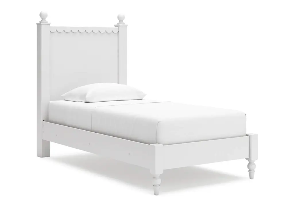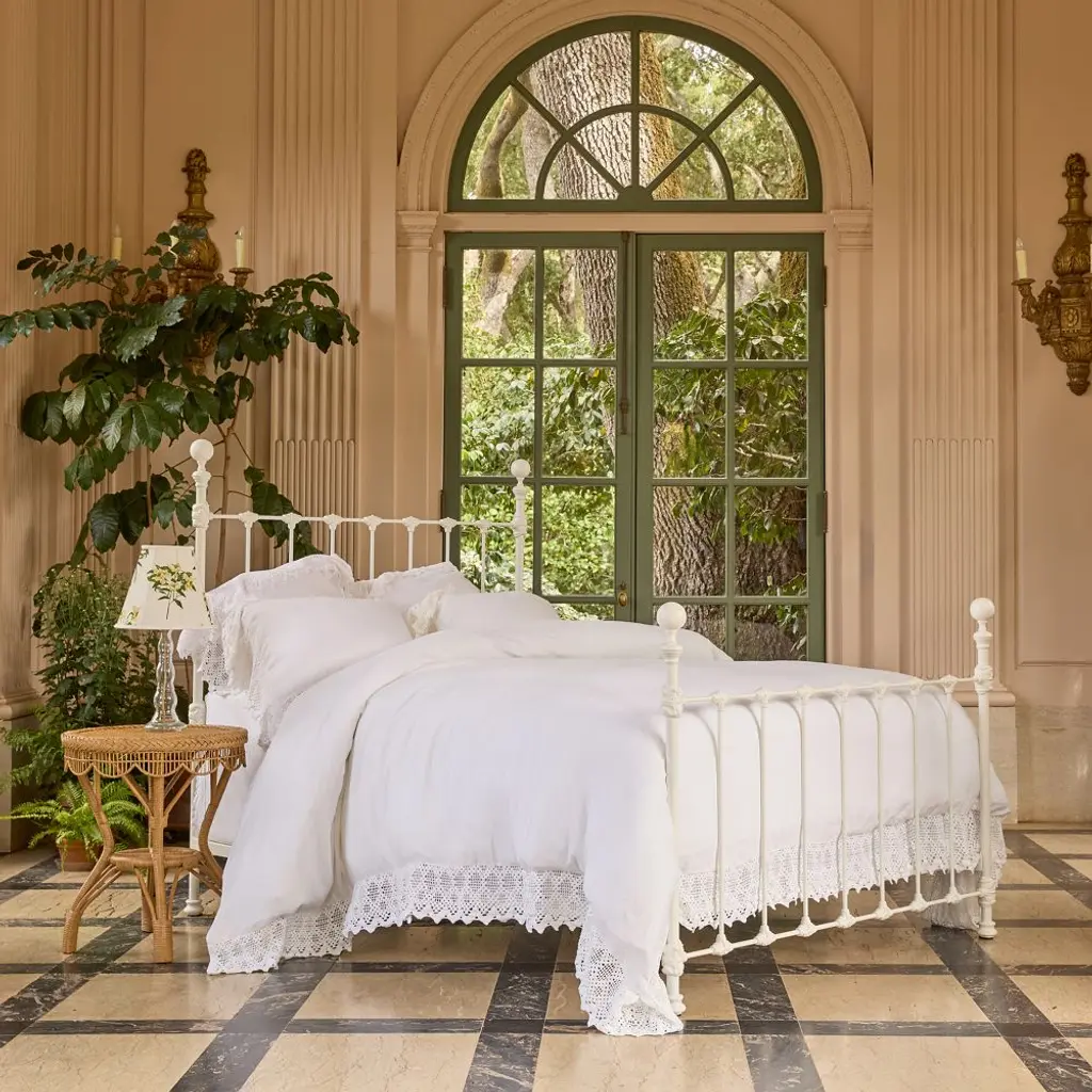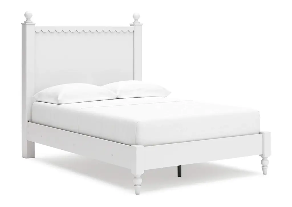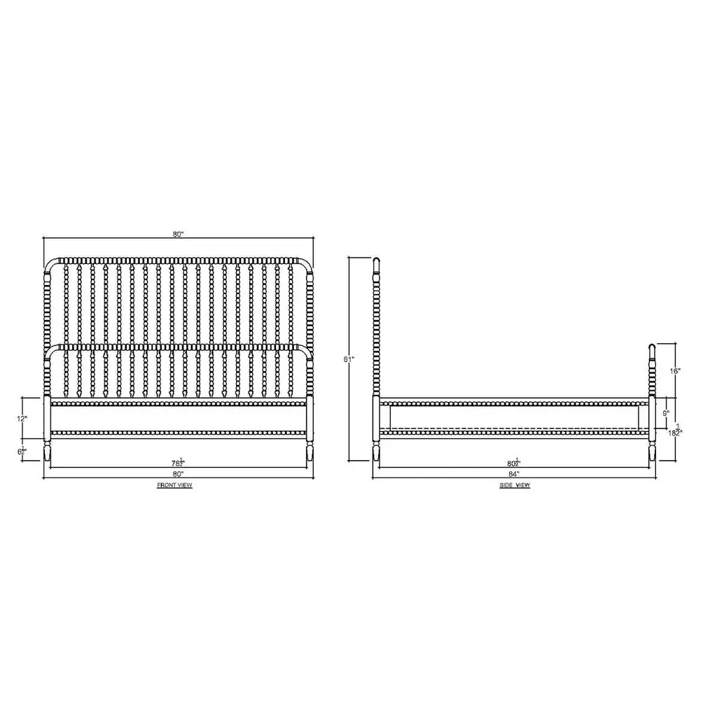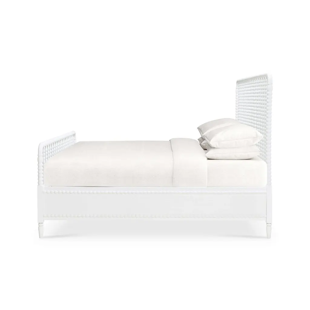 Constructed with mahogany and in our lightly distressed Architectural White finish. This beautifully crafted bedframe combines classic design elements with sturdy construction, creating a timeless centerpiece for your bedroom.Features intricately turned spindles on the headboard and footboard, adding a touch of vintage sophistication and visual interest and perfectly complementing a variety of decor styles from farmhouse to traditional.Dimensions: 80" W x 84" D x 61" H