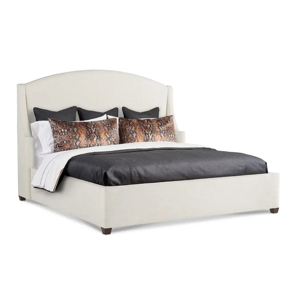 Exclusive to One Kings Lane: Made in the USA, this bed is upholstered in a print inspired by Mid-Century Modern finesse. The crescent legs echo the sweeping curve of the headboard, which is generously padded so that you can lean back in both comfort and style. Mattress and box spring are required.