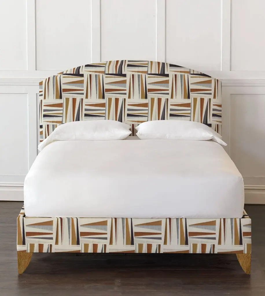 Exclusive to One Kings Lane: Made in the USA, this bed is upholstered in a print inspired by Mid-Century Modern finesse. The crescent legs echo the sweeping curve of the headboard, which is generously padded so that you can lean back in both comfort and style. Mattress and box spring are required.