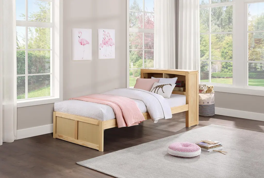 The Kory Natural Twin Wood Bookcase Bed combines traditional style with practical functionality. Crafted from natural pine, this bed features a bookcase headboard, making it a perfect addition to any bedroom. Its sturdy construction from pine veneer, wood, and engineered wood ensures durability and longevity.