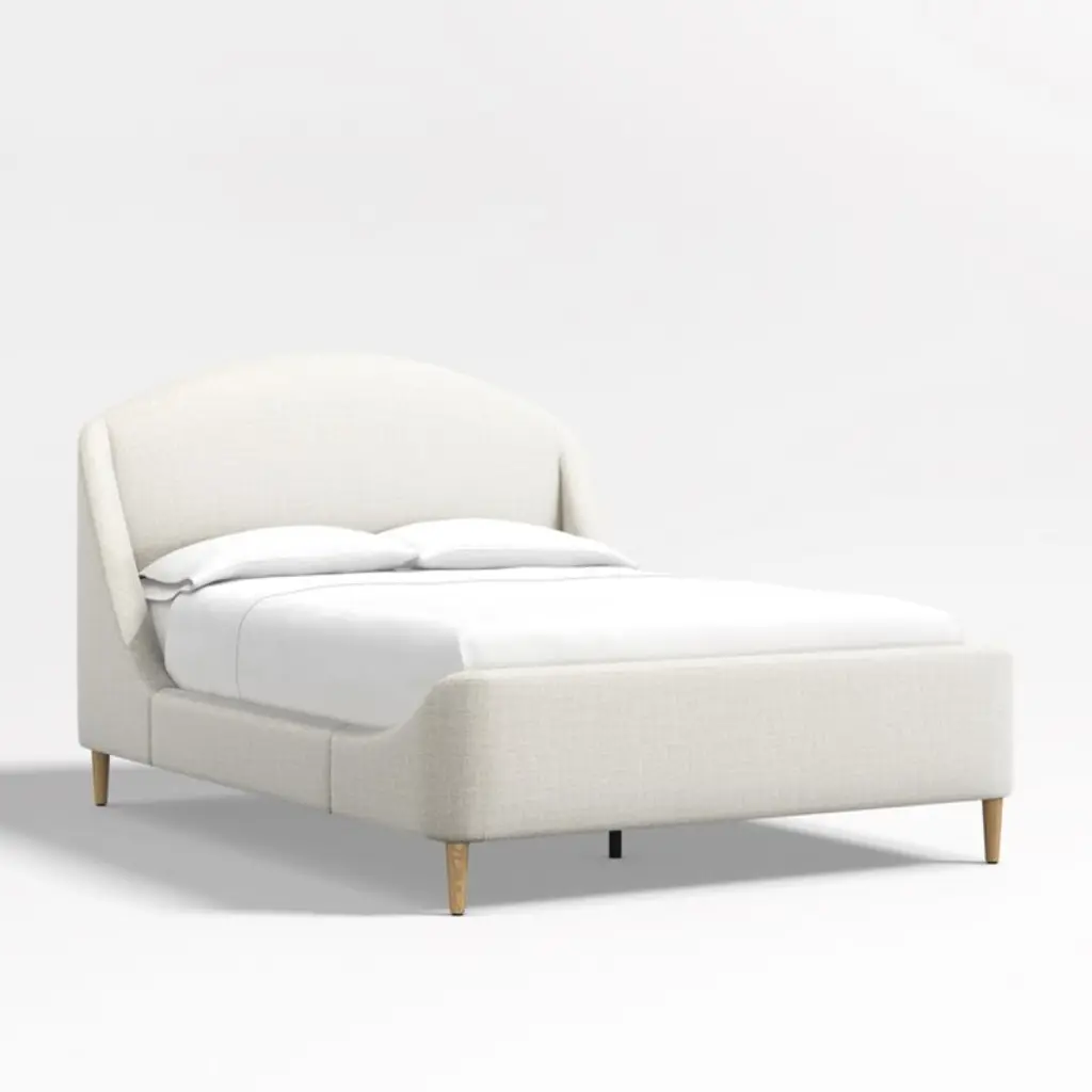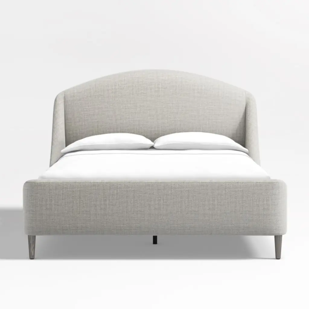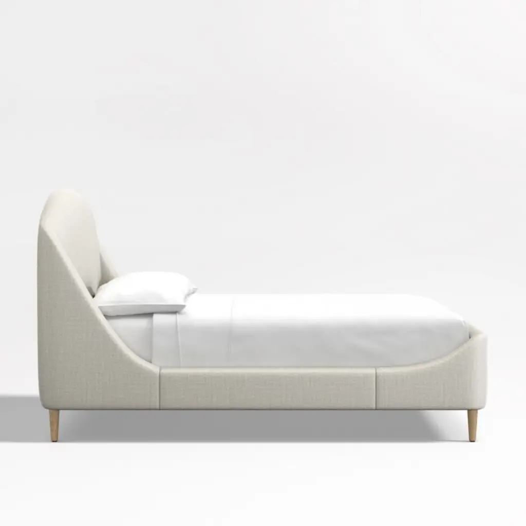 Lafayette streamlines the sumptuous curves of a French-style chaise into an upholstered bed for the modern bedroom. Fully upholstered in a naturally colored linen-like fabric, the bed curves down from the gently rounded headboard to slim rails that gracefully climb to form the lower-profile footboard. Turned solid oak legs have a natural finish to complement the upholstery and keep the look fresh and modern.By choosing FSC ®-certified furniture, you are supporting responsible management of the world's forests.