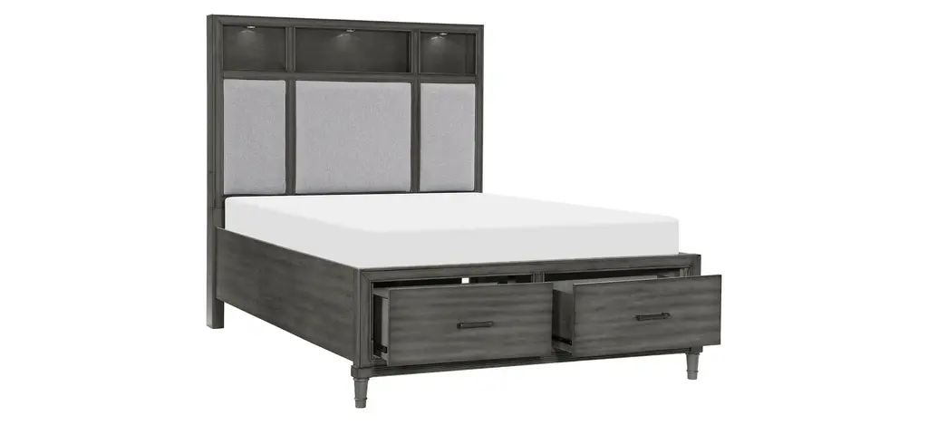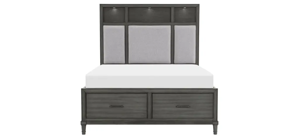 Modern convenience is paired with transitional style to create the versatile look of the Lana Bed. The multi-functional design of the bed allows for convenient storage within the footboard drawers, charging capability by way of the mounted USB ports, as well as display and illumination within the touch-engaged LED-lit open fronted bookshelves of the headboard. The bed's headboard also features pebble gray hued fabric inserts creating complementing contrast to the collections gray finish over okume veneer. Dark bronze finished knob and bar hardware front the drawers of the footboard.