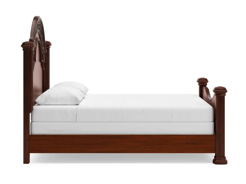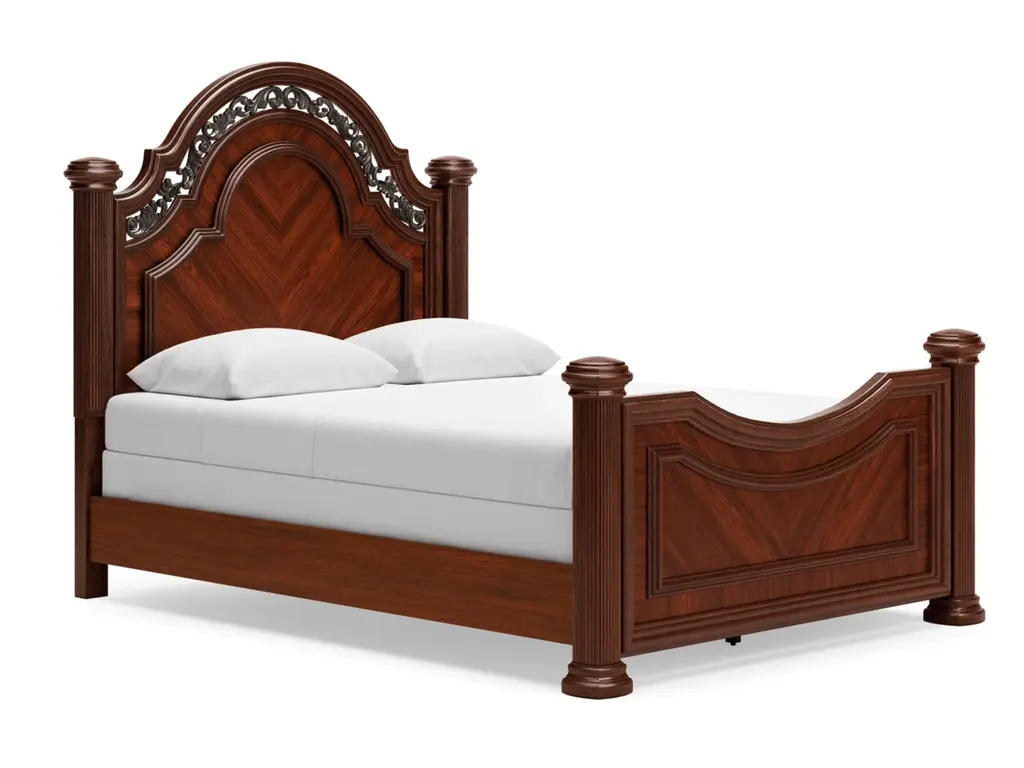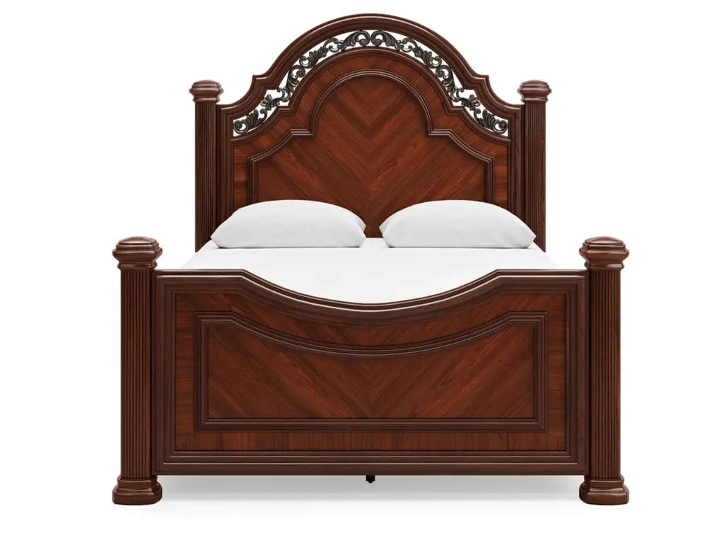 Take inspiration from the traditional luxury of the Lavinton poster bed. Classic with a rich cherry brown finish, its stately presence graces your room with an air of opulence. Your taste for exquisite details is satisfied with the headboard’s ornate accent filigree. With an elegantly crafted footboard completing the look, your restful retreat has never been so refined.