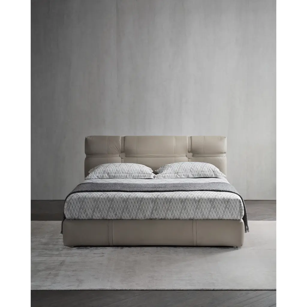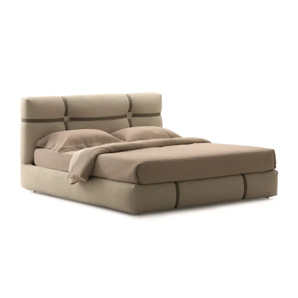 Elegantly tailored details for a double-size bed characterized by an unusual combination of straps and eyelets on the headboard and the panel surrounding the bed. Original, contemporary and unmistakeable, New Bond is even more stylish with its top quality leather covers and straps, in the same shades.