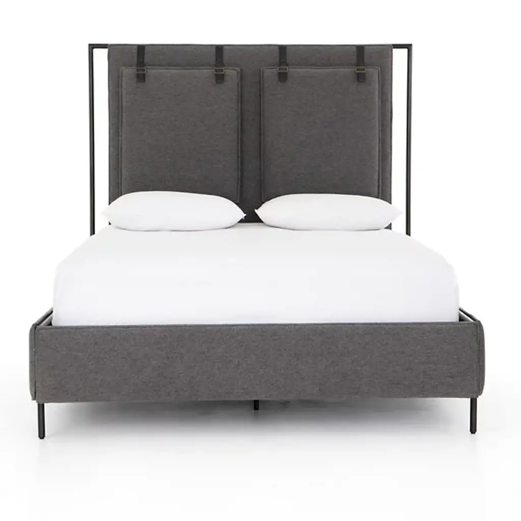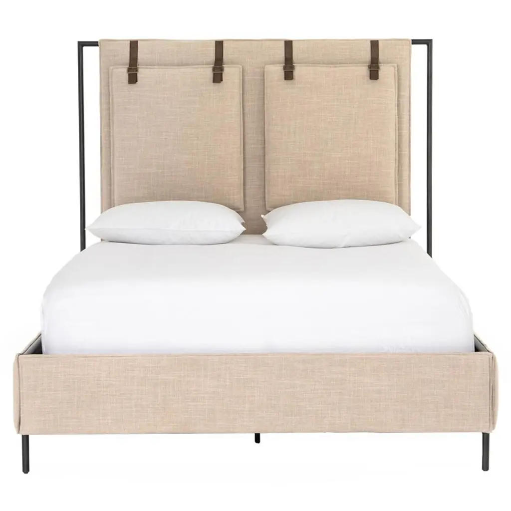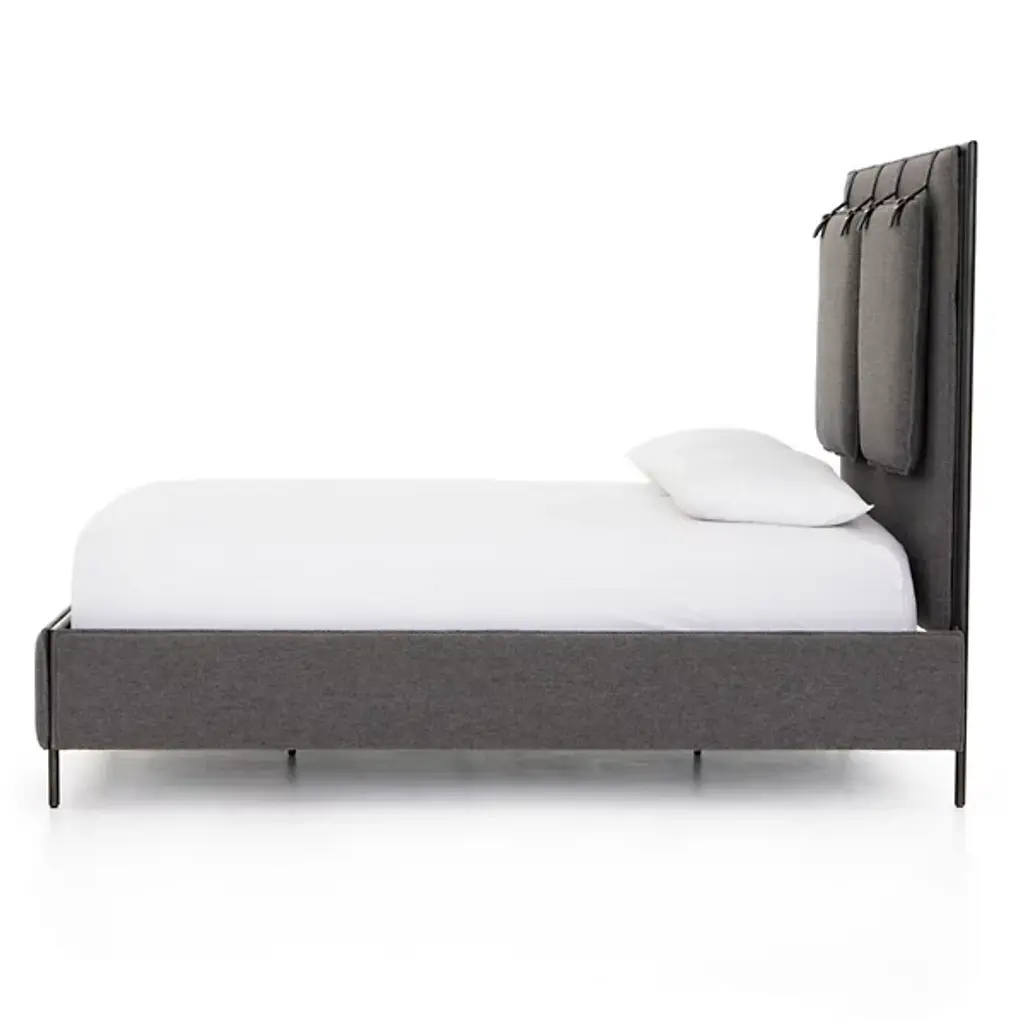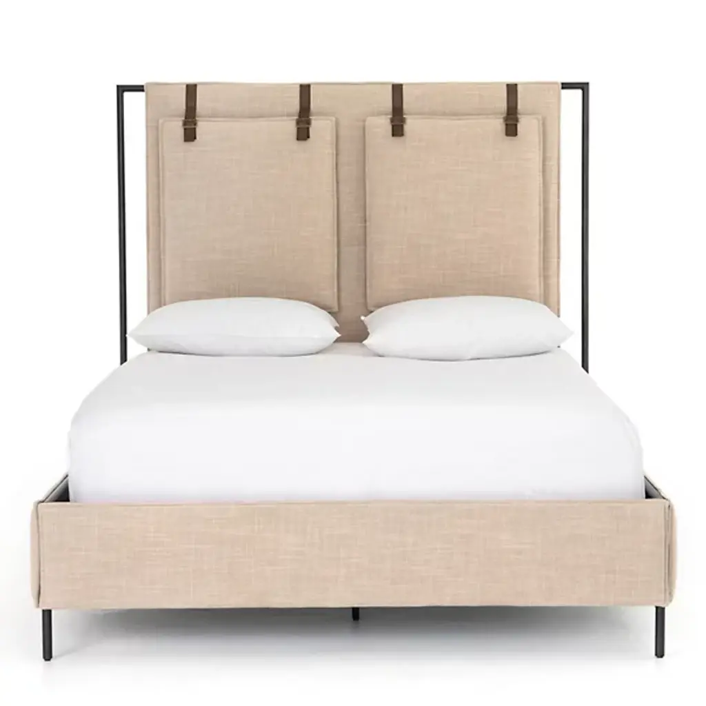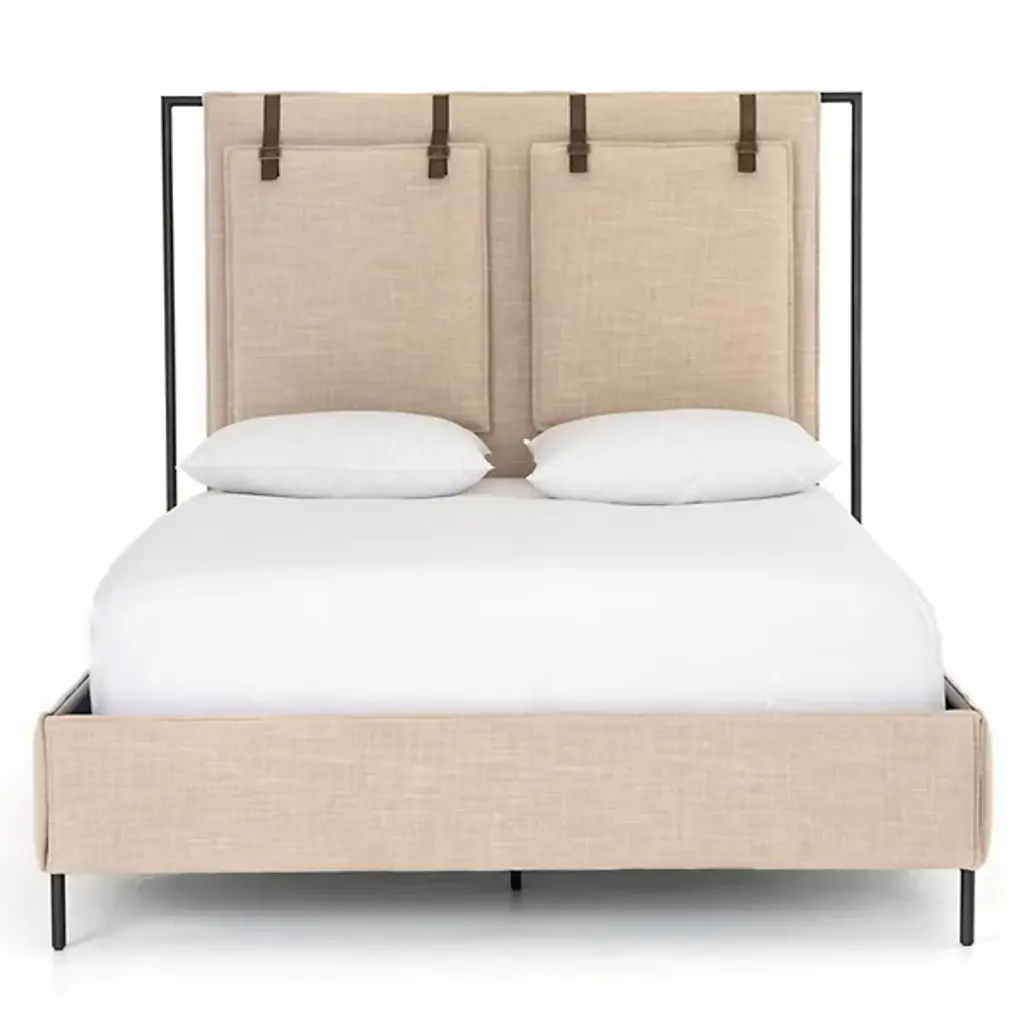 Safari-inspired design with a modern presentation. The Leigh Upholstered Bed from Four Hands twist. Soft polyester upholstery is set inside upholstery, adding a soft, luxurious feel, contrasting a velvet surface with brown leather straps that secure decorative headboard pillows. The design creates a striking visual contrast supported by a sturdy frame of iron and poplar plywood. This bed creates rustic modern charm, adding stylish retro charm and classic comfort to any bedroom.