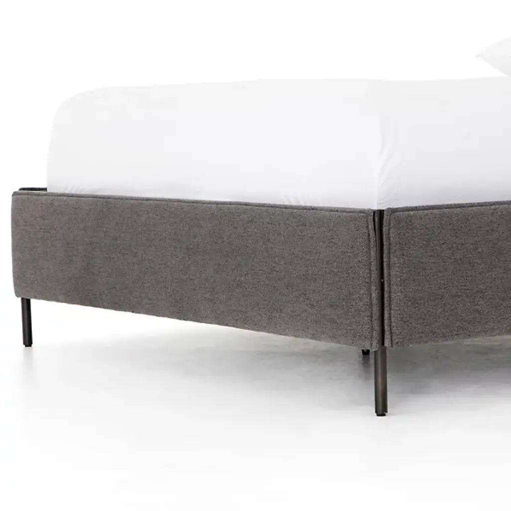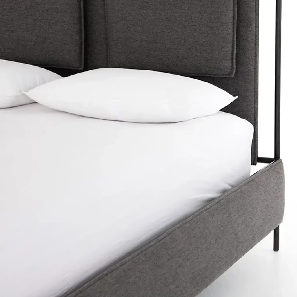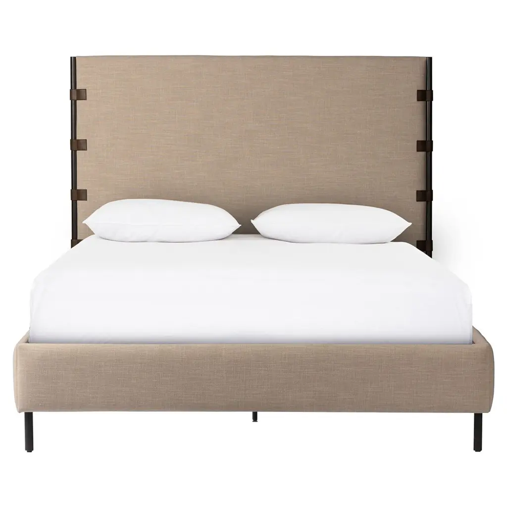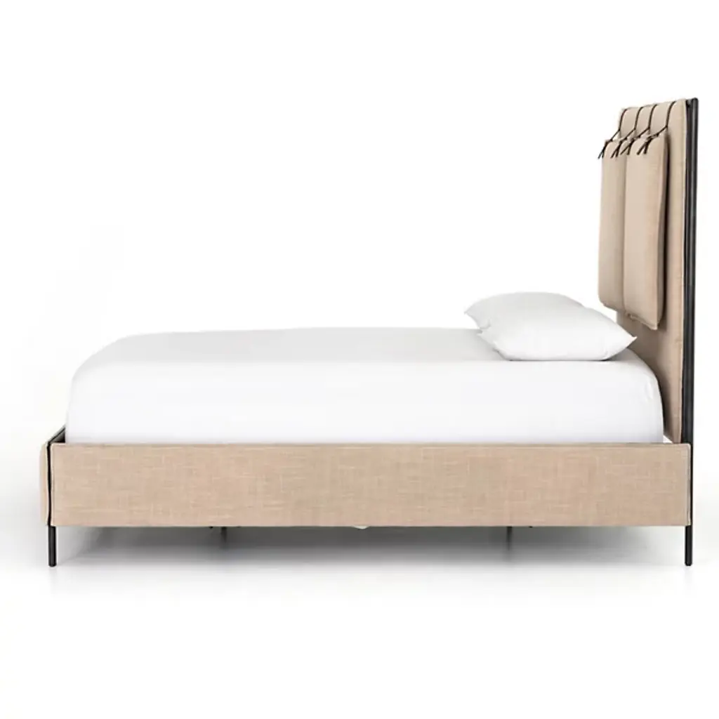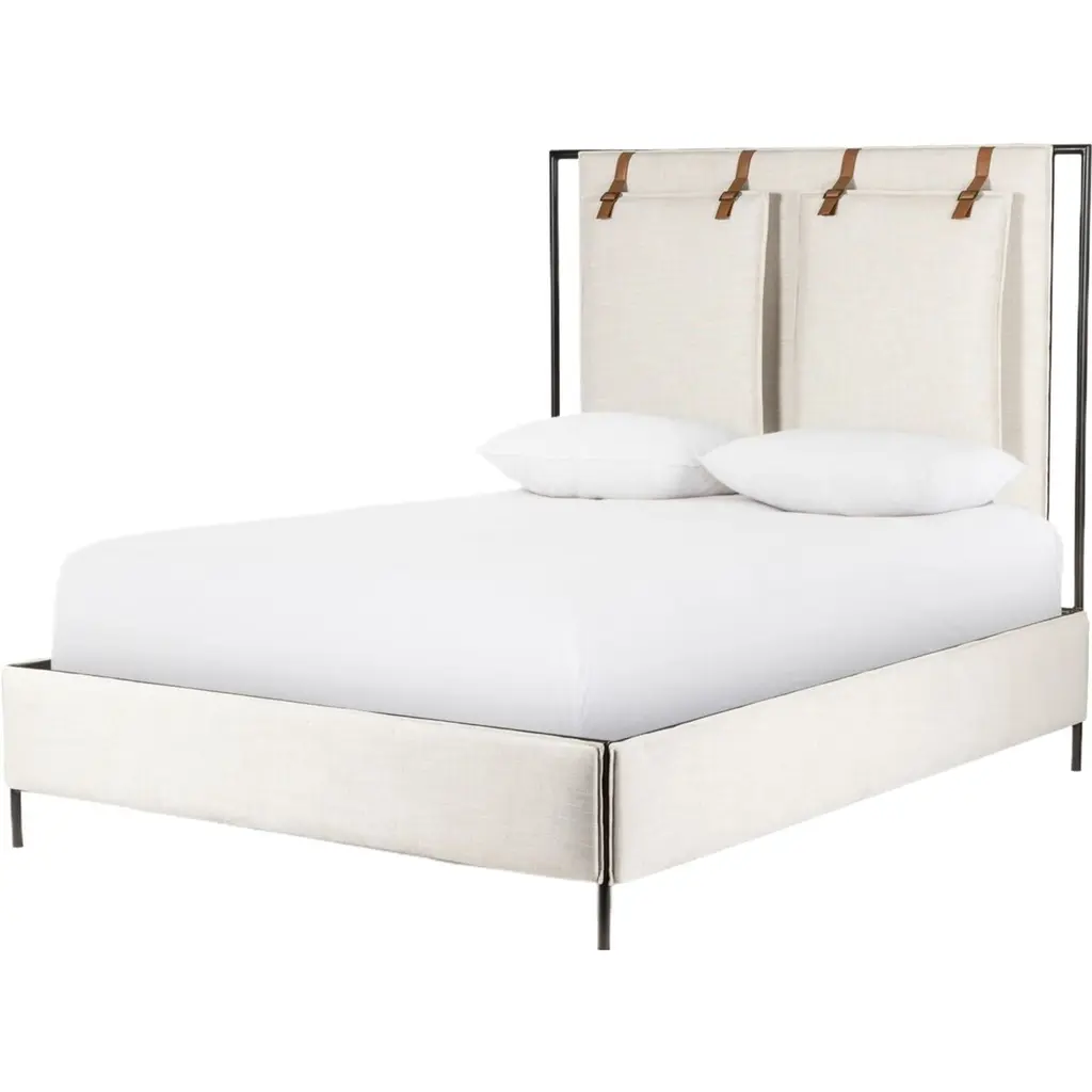 Safari-inspired design with a modern presentation. The Leigh Upholstered Bed from Four Hands twist. Soft polyester upholstery is set inside upholstery, adding a soft, luxurious feel, contrasting a velvet surface with brown leather straps that secure decorative headboard pillows. The design creates a striking visual contrast supported by a sturdy frame of iron and poplar plywood. This bed creates rustic modern charm, adding stylish retro charm and classic comfort to any bedroom.