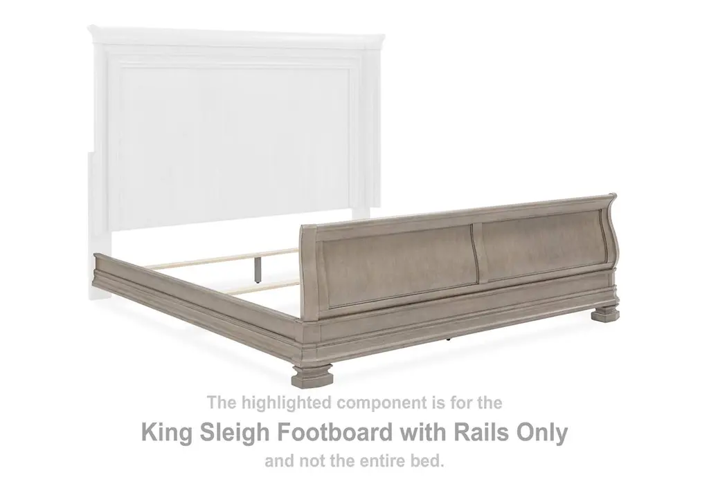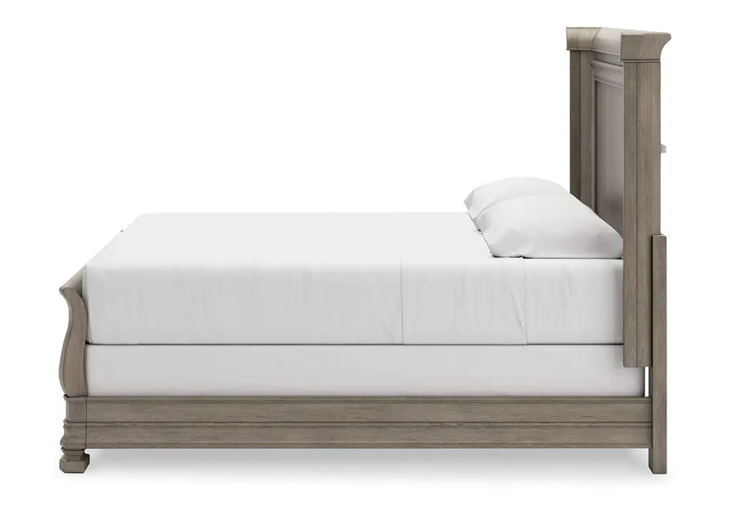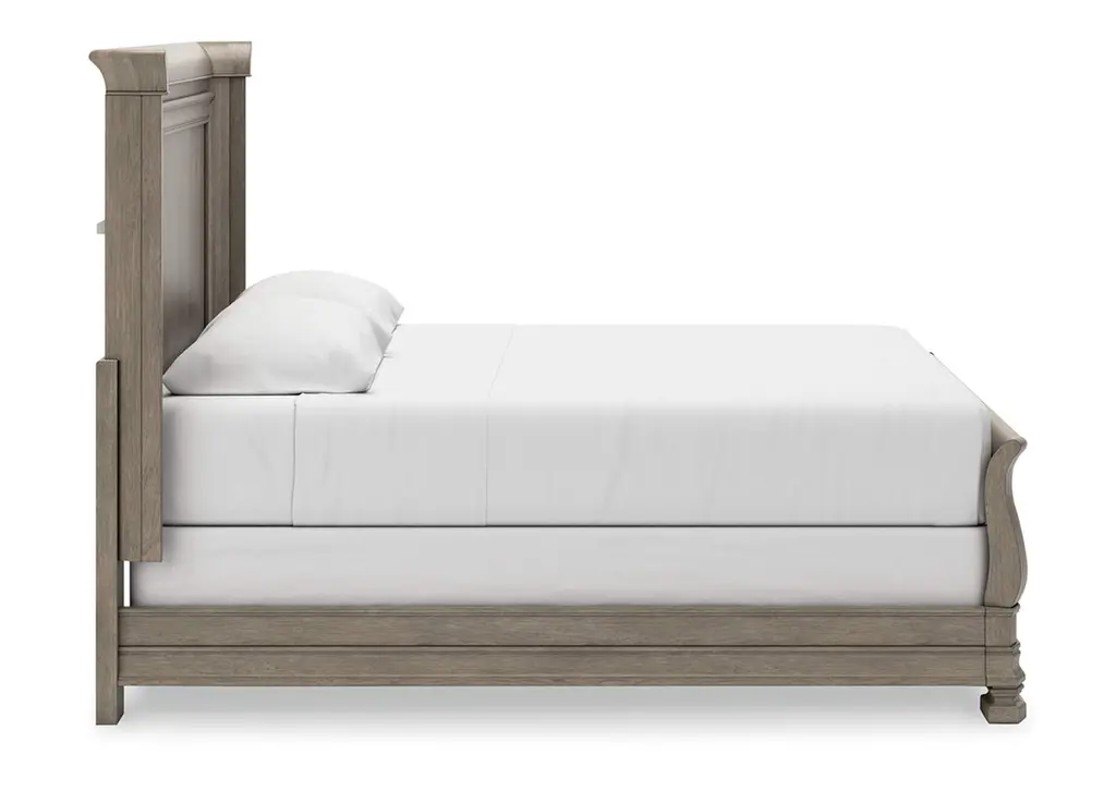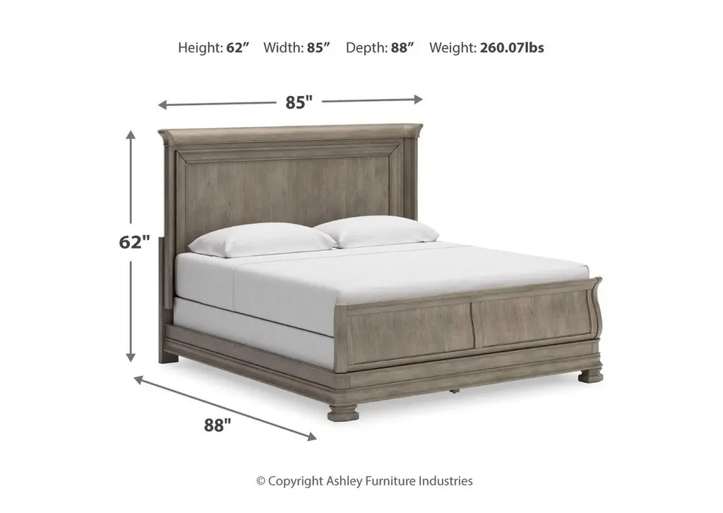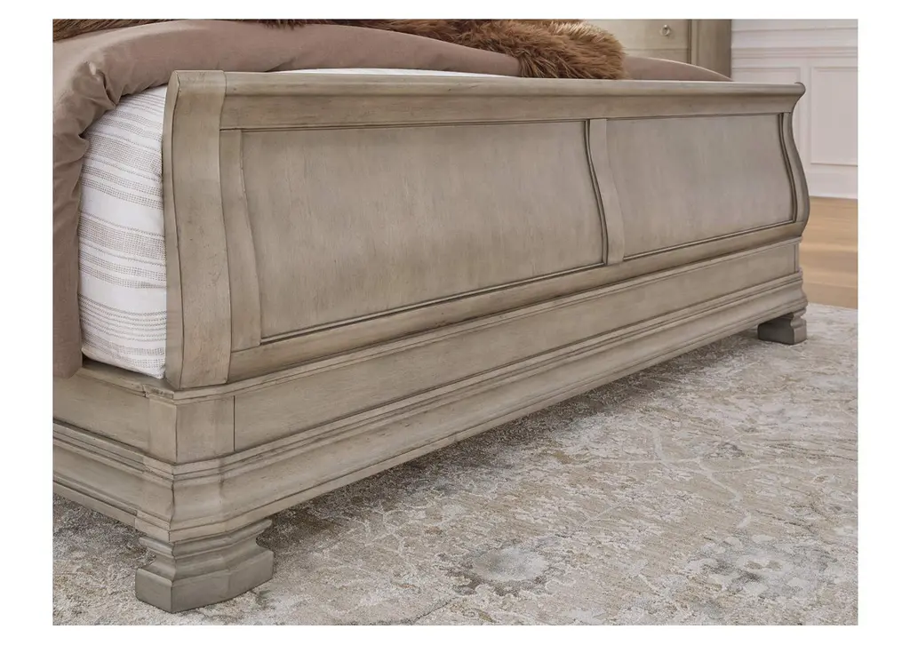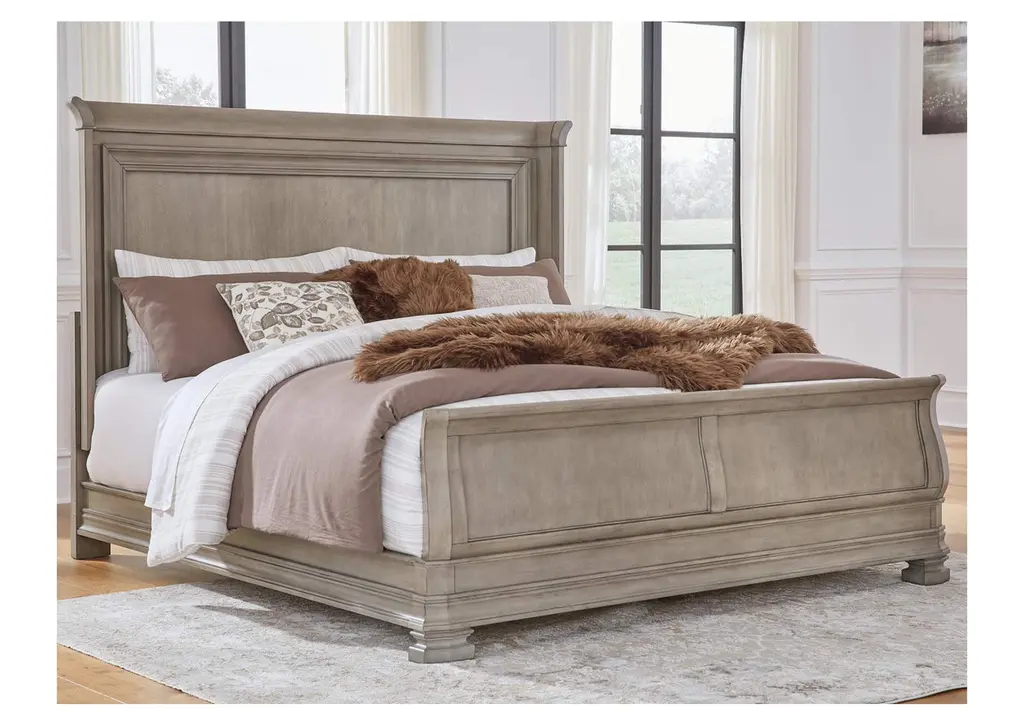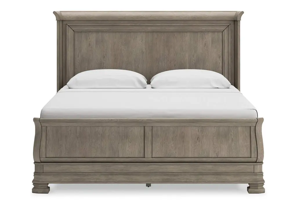 Traditional design motifs, redefined for today’s trends. Inspired by timeless Louis Philippe styling, the Lexorne king sleigh bed is distinguished by its stunning attention to detail. You’ll find the light gray finish encourages an attitude of laid-back luxury. Complete with a shelter wing headboard design and a thick profiled base, it reigns over your bedroom with an air of casual elegance. Weight 221.000 lbs. (99.45kgs.)