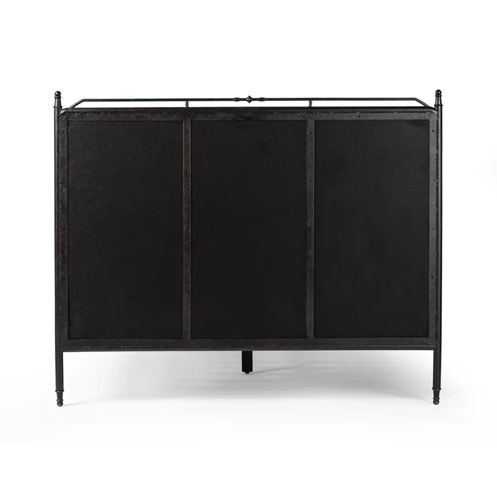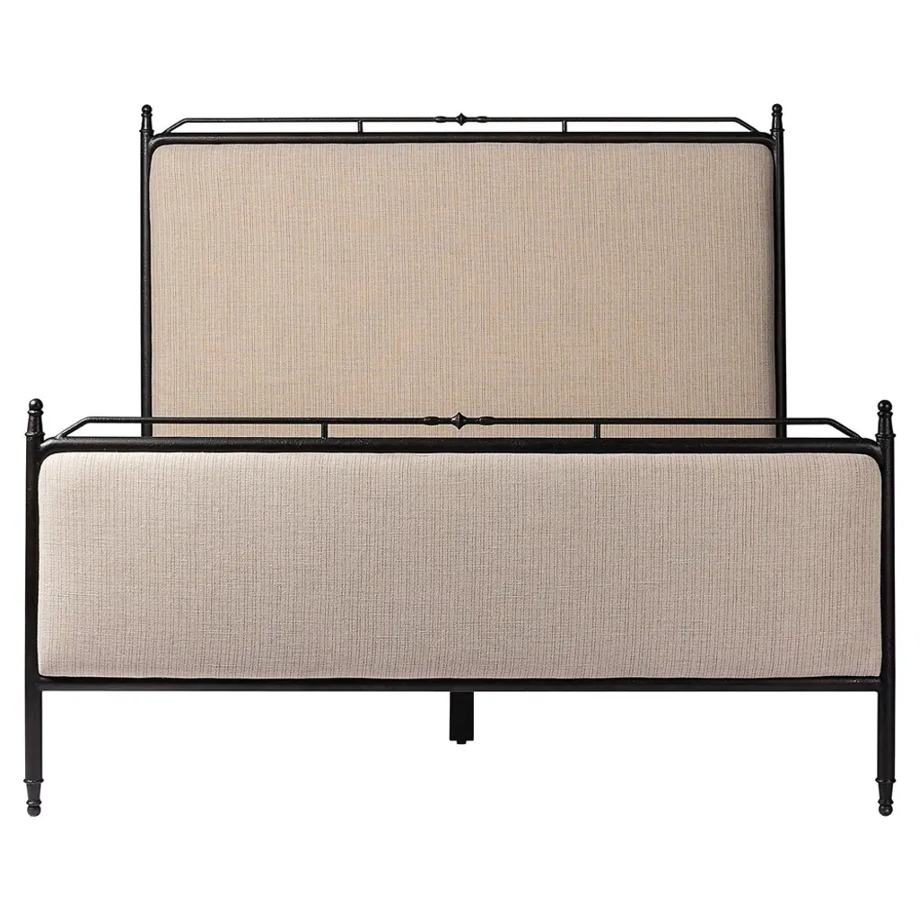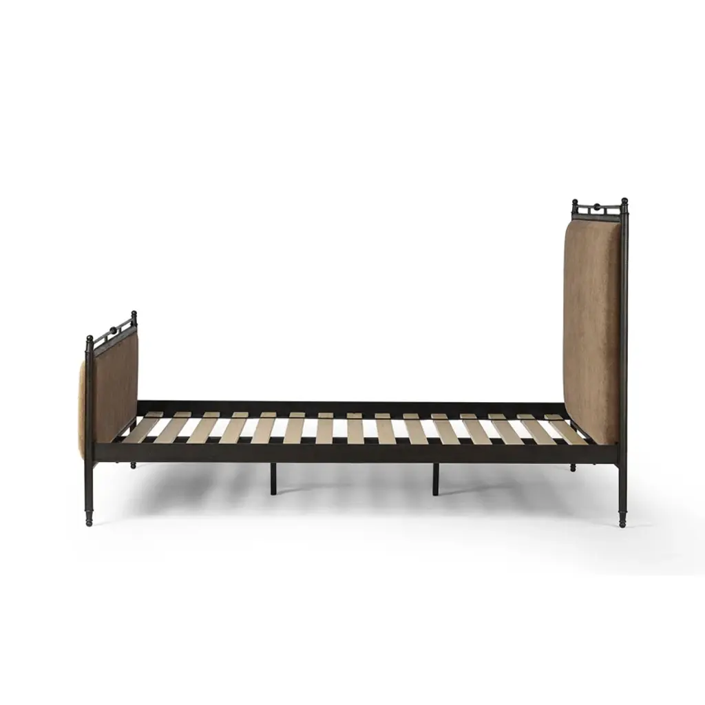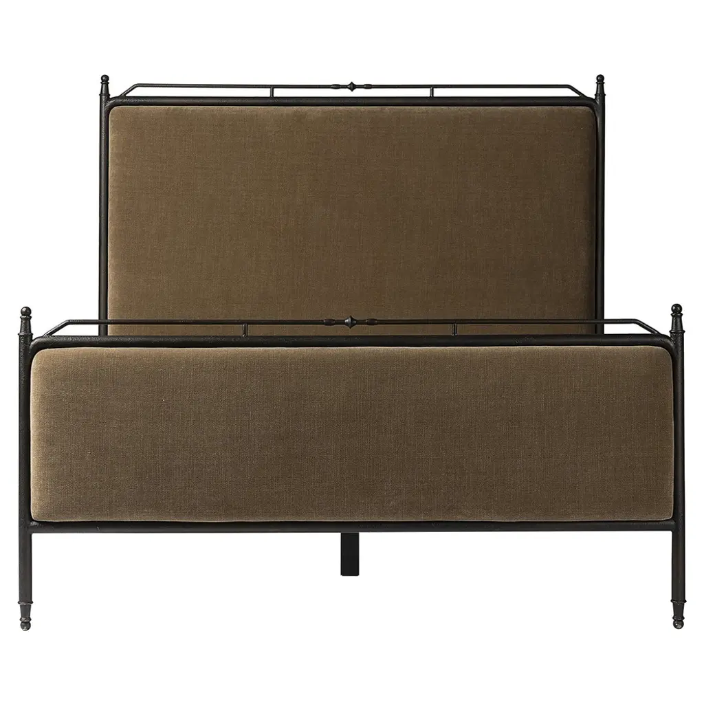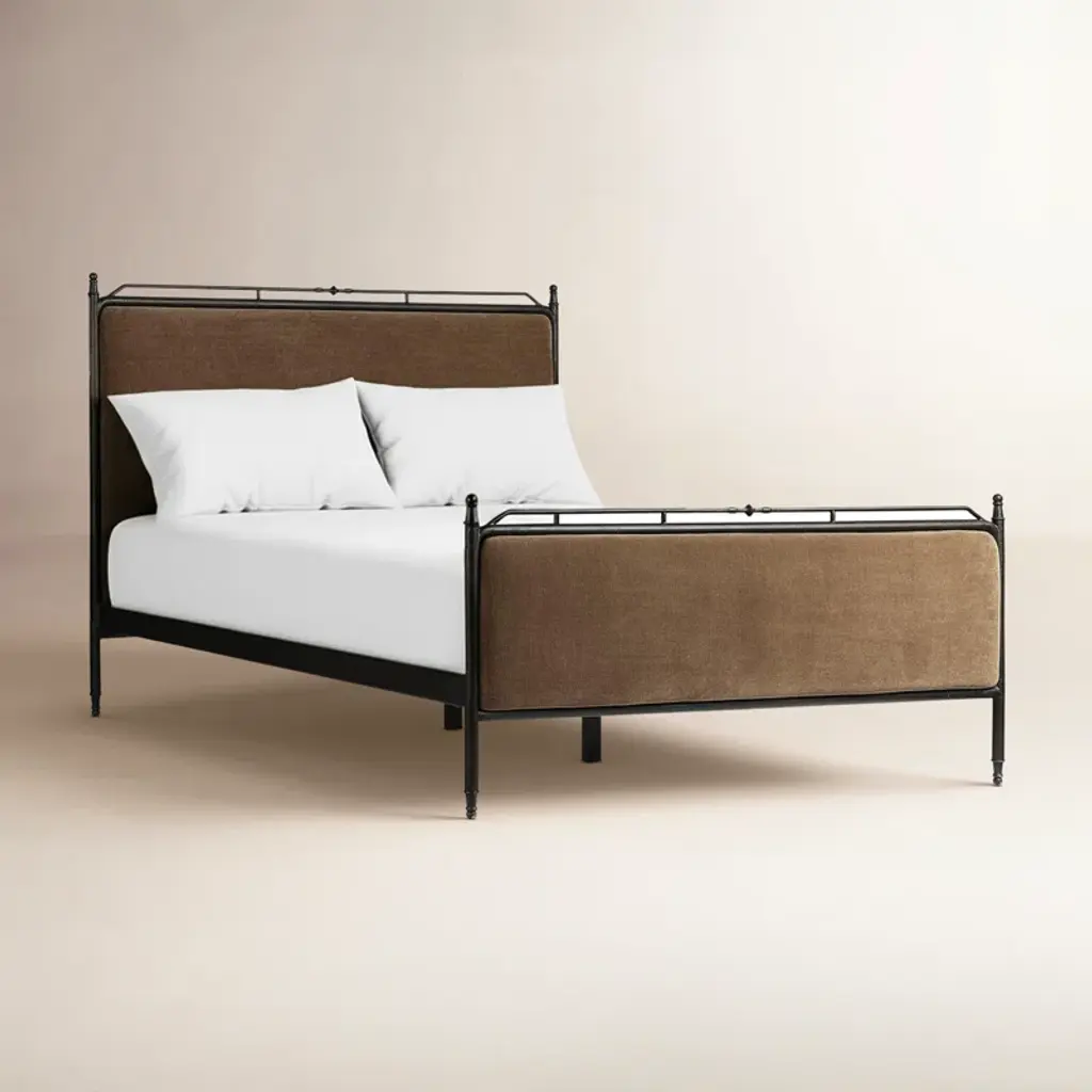 A design collaboration by Amber Lewis and Four Hands. Bring comfort and warmth to the bedroom with an inviting mix of materials. The bed frame is crafted from iron in an antique black finish for an aged look. Paired with a padded headboard and footboard in a warm brown chenille fabric. Features turned detailing along the top and bottom rails and legs.