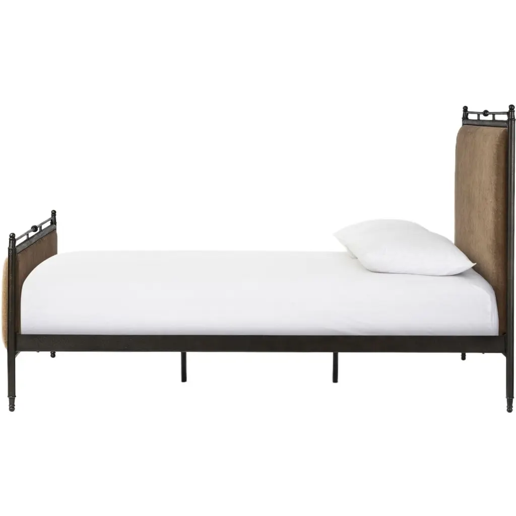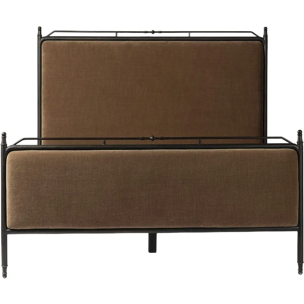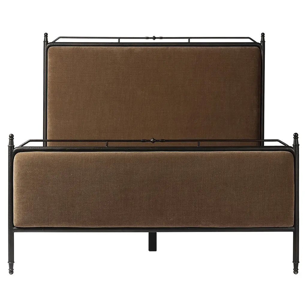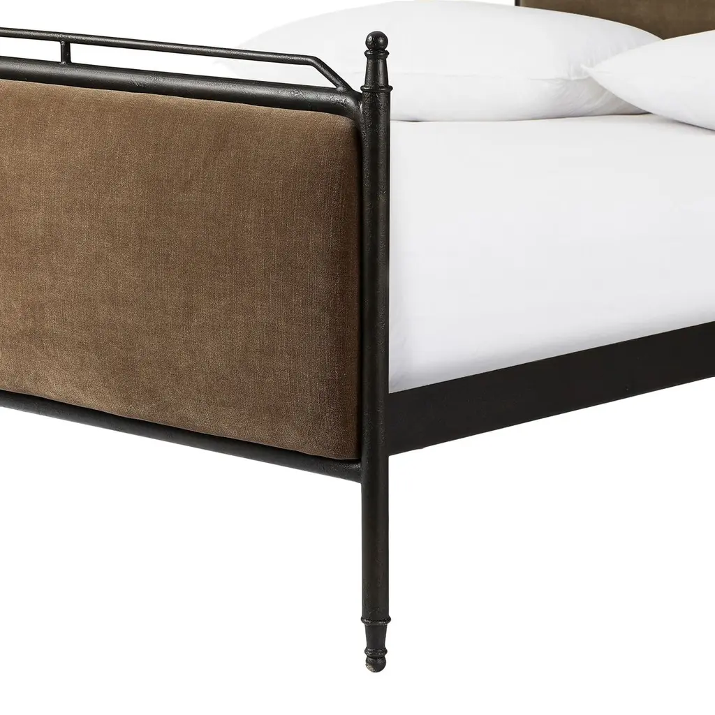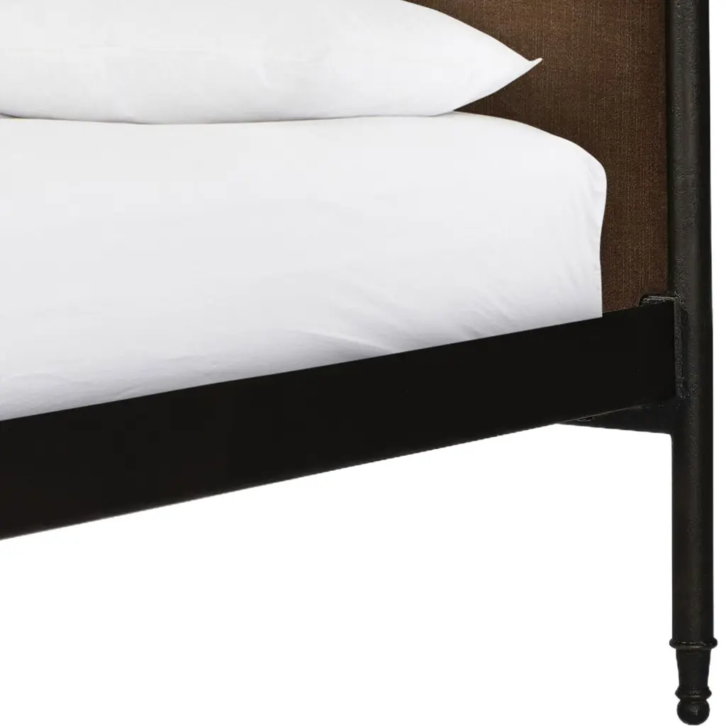 Bring comfort and warmth to the bedroom with an inviting mix of materials. The bed frame is crafted from iron in an antique black finish for an aged look. It features a padded headboard and footboard, offering a touch of elegance and comfort. The design includes turned detailing along the top and bottom rails and legs, showcasing a collaboration by Amber Lewis and Four Hands.