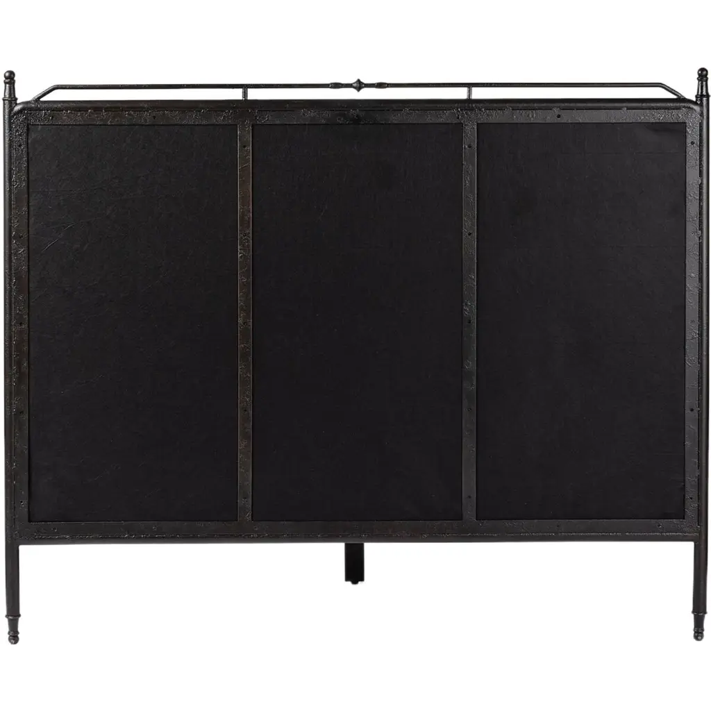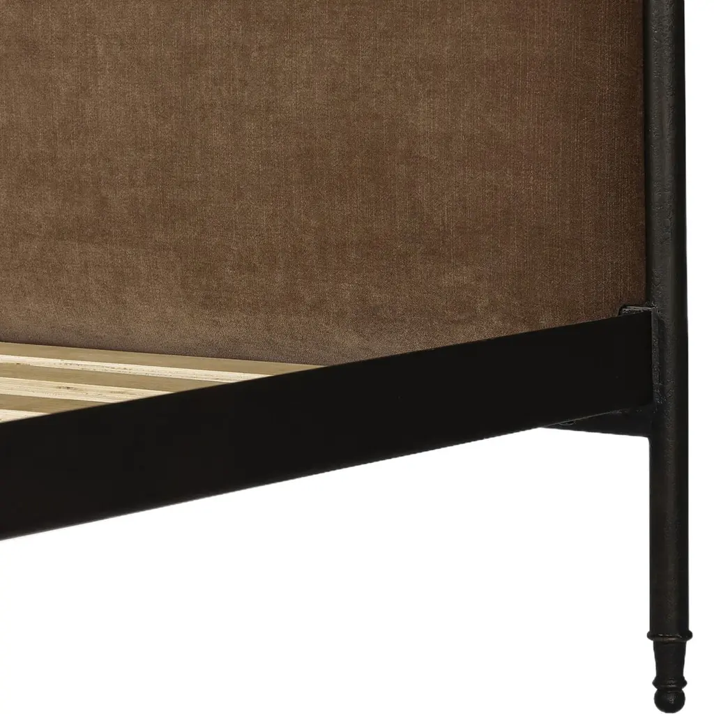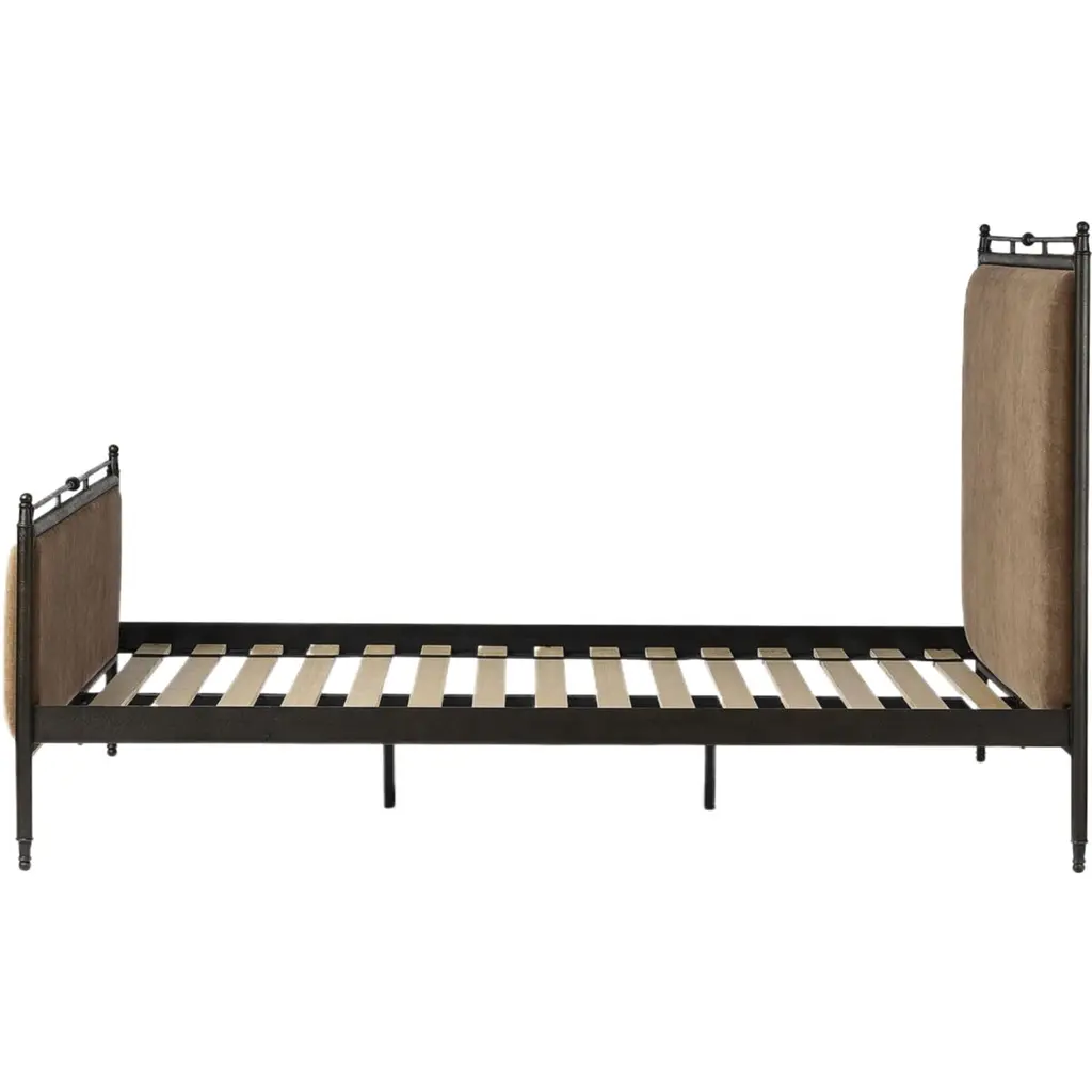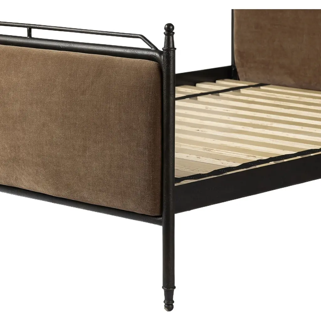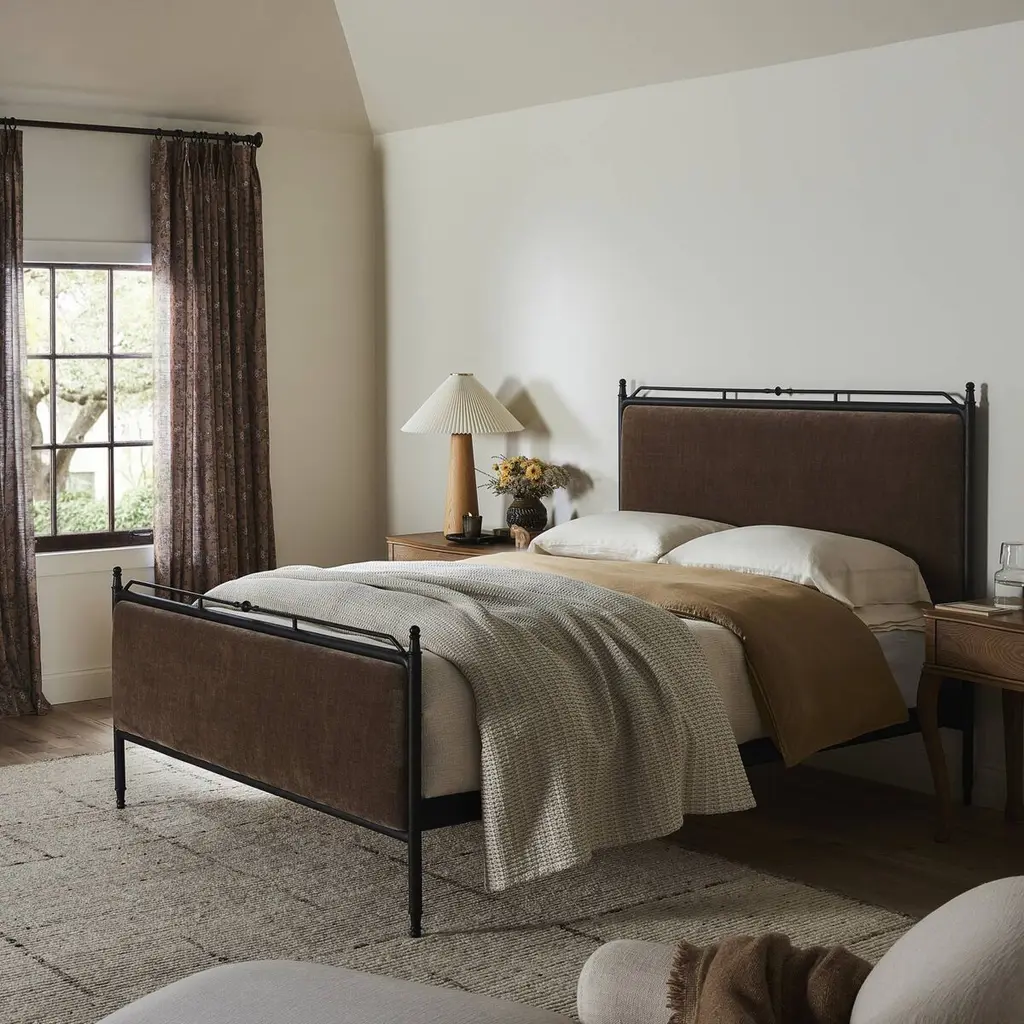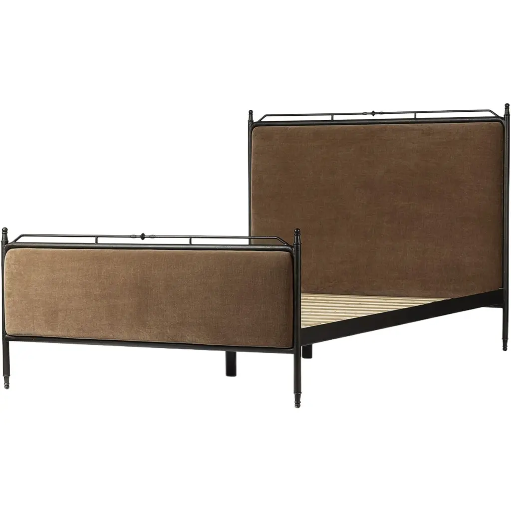 Bring comfort and warmth to the bedroom with an inviting mix of materials. The bed frame is crafted from iron in an antique black finish for an aged look. It features a padded headboard and footboard, offering a touch of elegance and comfort. The design includes turned detailing along the top and bottom rails and legs, showcasing a collaboration by Amber Lewis and Four Hands.
