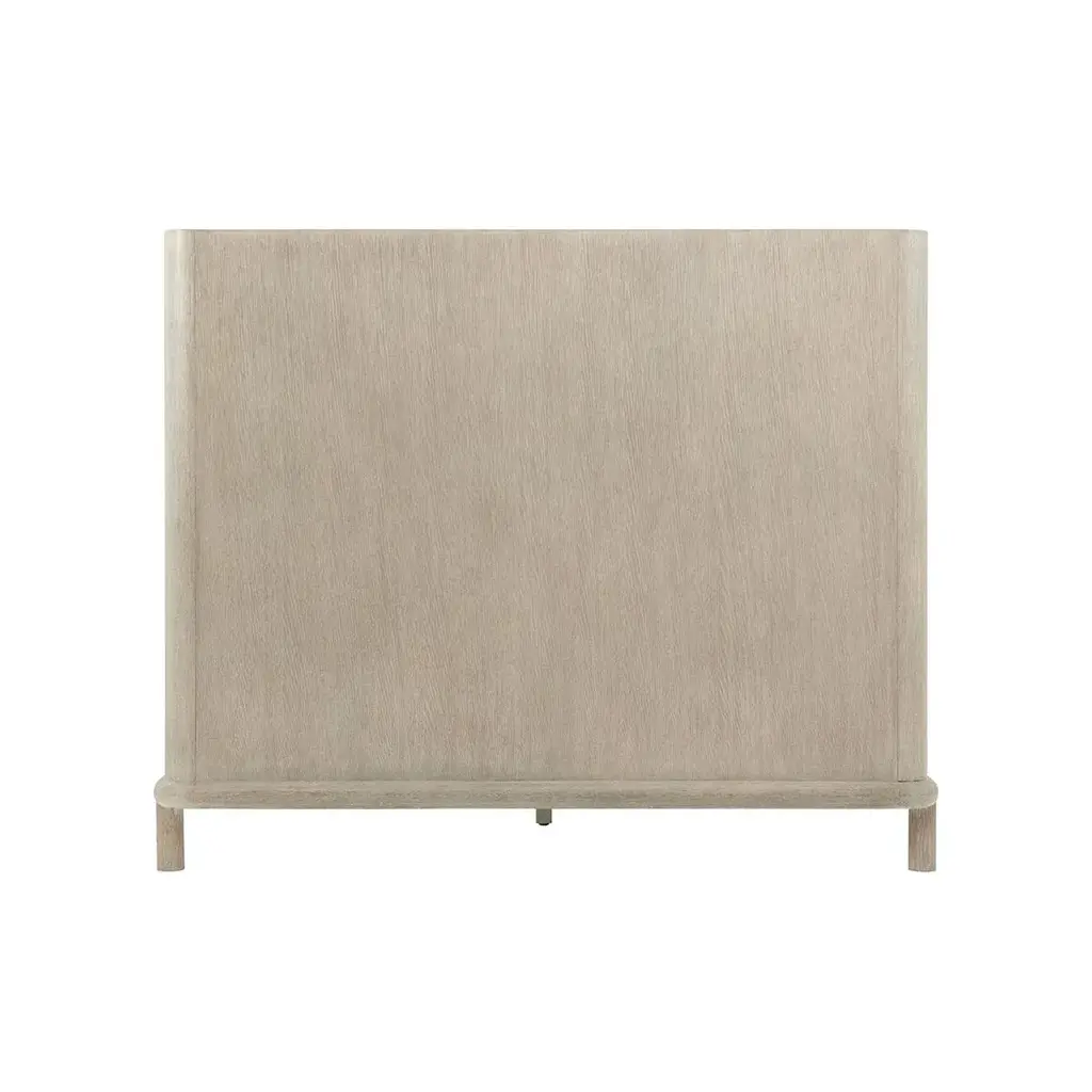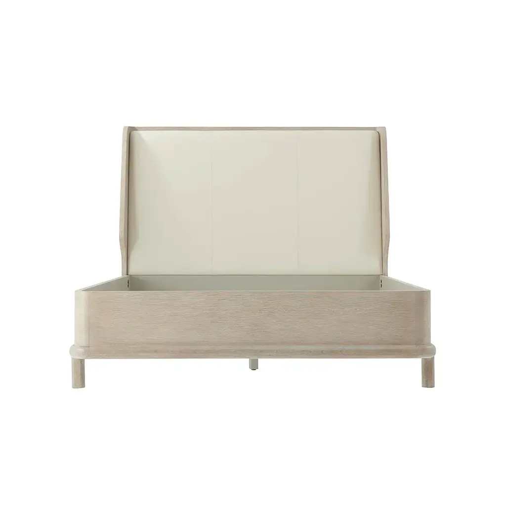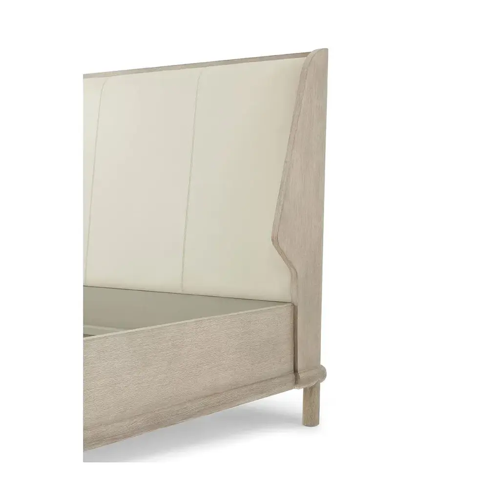 Beautifully raised on round Mission-style legs. The leather upholstered wing back headboard is fully veneered on the back as are the rails and footboard. Dimensions: 66.75" W x 91.5" D x 54.25" H Shown in Grey Oak Finish Shown in Twild-LE0295 Leather For Queen mattress - 60 x 80" Side and Front Rail Apron Clearance: 5½ in